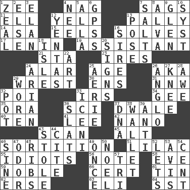 ACROSS 1. Last letter of the English alphabet 4. Tired old horse 7. Sinks 11. Pipe bend 12. Sharp bark 13. Chummy 14. White ___ sheet 15. Snakelike fish 16. Finds the solution 17. Soviet premier 1918-24 19. Aide 21. R.R. building 23. Angers 24. Having or resembling wings 25. Mature 26. Alias (abbr.) 29. Obtain by seizing forcibly or violently 30. Followers of ems 31. Compass dir. 32. Luau course 33. Big collection agency 34. Turn to the right 35. Mouth or opening 36. _-fi 37. A sleeping potion; an opiate (poet.) 40. Nine, plus one 41. Area sheltered from the wind 42. Billionth: prefix 43. Examine hastily 45. Keyboard modifier key 46. Making a chance decision by using lots 51. Pale purple color 55. Foolish or stupid persons 56. Brief written record 58. Night before a holiday 59. Impressive in appearance 60. Foregone conclusion 61. Metal container 62. Celtic language 63. Connecticut Ivy Leaguer 64. Fast jet (abbr.) DOWN 1. Ardor 2. Otherwise 3. Liveliness 4. Born 5. Silent film actress Nazimova 6. Global Positioning Systems (abbr.) 7. Table seasonings 8. Inventor's middle name 9. Small, secluded valley 10. System (abbr.) 12. Gossips 13. Airs 16. Male parents of animals 18. Capri or Wight 20. Omens 22. Nonscientific branch of learning 24. Believer in; advocate of (suffix) 25. Nest on high 26. White American of non-Hispanic descent 27. Leg joint 28. Deep reverence 29. Had on 32. Plant holder 33. Ancient Celtic tribe of eastern Britain 36. Narrow boards 37. Heredity factor (abbr.) 38. Place for singles 39. Opposed to 43. Fur scarf 44. Quote 46. Trig term 47. Aroma 48. Teases 49. Single time 50. Christmas carol 52. Allows 53. Deliberation 54. Penny 57. Three (prefix)