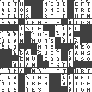 ACROSS 1. Writer of Portnoy's Complaint (1969) 5. Ancient Persian 9. Newt 12. Goodbye (Sp.) 14. Presage 15. Three (prefix) 16. Portable shelters 17. Cause heat under the collar 18. Layer 19. Compass dir. 20. Cigar-shaped 23. Auction offers 24. Capri or Wight 25. Torque (variant) 27. Pacific island yam 30. "We ___ not amused" (Victoria) 32. Epoch 33. ____ Bator, Mongolia 34. Religious women 36. "One Day ___ Time" 38. Connecticut Ivy Leaguer 39. Compass dir. 40. Modern: prefix 43. Basketball assoc. 46. Costume for a special activity 48. Zero-star reviews 49. Australian flightless bird 51. Wedding promise 52. In addition 53. Actor Alda or Thicke 54. Made supply last 56. Pale green bean 58. Place for singles 61. RI univ. 64. _ tizzy (2 wds.) 65. Male parent of an animal 66. Music written for nine 68. Mountains (abbr.) 69. Angers 70. Remain 71. Raised railways 72. Trial 73. Smallest unit of an element DOWN 1. Pace 2. Lyric poems 3. Prong on a fork 4. Being at a high temperature 5. Greater amount 6. Send forth 7. Erase 8. Compass dir. 9. Moral principle 10. Flintstone 11. Canisters 13. Fast planes 21. Style 22. Summer TV shows 23. Naughty child 24. Electrically charged atom 26. Mouth or opening 27. Third day of the wk. 28. Everything 29. Precipitation 31. World-weariness 35. A glass for beer 37. Of or related to the anus 41. Followers of ems 42. Bear (Spanish) 44. Actor Lugosi 45. Nanny (var.) 47. Puff or smoke 48. Groovy apt. 50. Undo the wiring of 53. Collect or gather 55. Inactive volcano in Sicily 56. Citrus frut 57. International (abbr.) 59. Ancient Greek god of war 60. For fear that 61. A single undivided whole 62. Do over again 63. A whole individual unit 65. Be seated 67. Chief or king in Benin or Nigeria