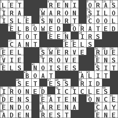 ACROSS 1. Allow 4. Painter Guido (1575-1642) 8. Mouths or openings 12. Lyricist Gershwin 13. Make _____ (do battle with) 14. Grain storage tower 15. Capri or Wight 17. Derisive sound 18. Calm and collected 19. Shoved, as through a crowd 21. Declaimed 23. Small child 24. Car or cant ending 26. Big collection agency 27. Patter 28. Snakelike fish 30. Snakelike fish 31. Turn aside suddenly 34. Regret 37. Compete 38. Collection of objects 39. Followers of ems 40. Raised railways 41. Annoying sounds 42. Be seated 43. Water vessel 44. Set down 46. Put into a specified state 47. Curvy letter 50. To free from 51. Pressed 54. Winter's stalactites 57. Hiding places for outlaws 58. Eroded 60. At one time in the past 62. Inside; within (prefix) 63. Sports stadium 64. Island 65. An important port of Yemen 66. Respite 67. Compass dir. DOWN 1. Cards in a Roman deck? 2. Celtic language 3. Baron Munchausen's specialties 4. Indian princess (variant) 5. Wear away 6. Not either 7. To the inside or interior of 8. Motion picture awards 9. Disturbances 10. _ vera 11. Disposed of to a purchaser 13. Compass dir. 16. Inky black, to poets 20. Baseball player Mel 22. Cause heat under the collar 25. Boldness 27. To provide with a ceiling 29. Nights before holidays 30. Night before a holiday 31. Portico 32. Compose 33. Greek goddess of the dawn 34. Dwelling 35. A single undivided whole 36. Eastern Standard Time (abbr.) 41. Make mention of 43. Gillaume's butler role 44. Curve 45. _ and Stitch 46. Something which is sent 48. Settings 49. Odor 51. The content of cognition 52. Tear apart 53. Letter starter 55. _ tizzy (2 wds.) 56. Examine minutely or intensely 59. "We ___ not amused" (Victoria) 61. Sight organ