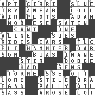 ACROSS 1. Fitting 4. High-altitude cloud 9. Change direction abruptly 13. Attempt 14. Approach 15. Hang loosely or laxly 16. Atmosphere 17. Schemes 18. First of billions? 19. Disorderly crowd 21. Compass dir. 22. Smooth fabric 24. Patter 26. Single 27. Place in a line 29. Institutes legal proceedings 30. Amusement-park features 31. Hearing organs 33. Affectionate concern, for short 36. Connecticut Ivy Leaguer 37. More given to overacting 40. Rowing implement 41. Male child 42. Prejudice 43. Silly 45. Tumult 47. Evade 48. Possessed 49. Elected reps. 50. Singer Mel 52. Compass dir. 54. Baseball player Mel 56. Old wives' tales, e.g. 57. Vertical member of a panel or frame 59. Mouth or opening 61. Mild oath 62. Friendly 63. Lubricate 64. Backtalk 65. Came up 66. Car dealer's back yard DOWN 1. _ moment's notice (2 wds.) 2. Demure 3. Polypeptide antibiotic 4. Head covering 5. An arm off of a larger body of water 6. Vintage cars 7. Pace 8. Big collection agency 9. Chalkboards 10. Farming town in central California 11. ____ Bator 12. Shade tree 20. Object of repulsion 22. Lush 23. One (Scot) 25. Soft 27. Ancient Greek god of war 28. _ and Stitch 29. Indian titles of respect 31. Independent ruler or chieftain 32. Nursemaid (var.) 33. Inedible or poisonous agaric 34. Austrian-born American filmmaker Fritz 35. Algonquian 38. Stay 39. Travel on or in a vehicle 44. Words to Nanette 45. Fragments 46. Scottish cap 49. Exchanges for money 50. Ancient Roman robe 51. Mouths or openings 52. Play the lead 53. Grain storage tower 55. Musical group of three 56. French article 57. Health resort 58. Sight organ 60. Keyboard modifier key