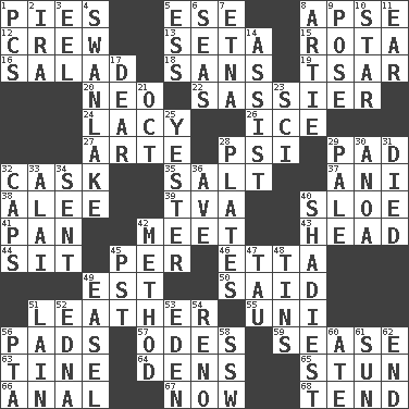 ACROSS 1. Sliced desserts 5. Compass dir. 8. Domed church section 12. Group working together 13. Stalk of a moss capsule 15. Round or rotation of duties 16. First course 18. Without 19. Russian ruler of old 20. Modern: prefix 22. More lively and spirited 24. Made of lace 26. Frozen water 27. Johnson of "Laugh-In" 28. Air pressure measure (abbr.) 29. Writing tablet 32. Keg 35. Table seasoning 37. Black tropical American cuckoo 38. Toward shelter 39. Federal power corp. 40. _ gin 41. Baking dish 42. Confront 43. Froth on beer 44. Be seated 45. For each 46. Singer James 49. Eastern Standard Time (abbr.) 50. Stated 51. Cordwainer's material 55. University (slang) 56. Groovy apts. 57. Lyric poems 59. Gospel singer Marvin 63. Prong on a fork 64. Habitations of wild animals 65. Surprise greatly 66. Of or related to the anus 67. At this time 68. Look after DOWN 1. Personal Computers (abbr.) 2. Lyricist Gershwin 3. Snakelike fish 4. Tchaikovsky ballet 5. Curvy letter 6. Oceans 7. Inactive volcano in Sicily 8. Nick name for Arthur 9. Airs 10. Play the lead 11. Ewer handle 14. Aid 17. Letter starter 21. Sep. follower 23. _-fi 25. Next before 28. Food holders 29. Diluted with white 30. Small Philippine buffalo 31. Passed on 32. Smile enhancers 33. Jai ____ 34. Emitted 36. "___ Maria" 40. Most dubious of character or honesty 42. Mode 45. Pacific Standard Time (abbr.) 47. The 19th letter of the Greek alphabet 48. Canisters 49. Artist's stand 51. (Had) reclined 52. Pulitzer Prize-winning author Ferber 53. Paradise 54. Former U.S. Attorney General Janet 56. Parent Teacher Association (abbr.) 58. Compass dir. 60. Had dinner 61. Player for Phoenix 62. Conclusion