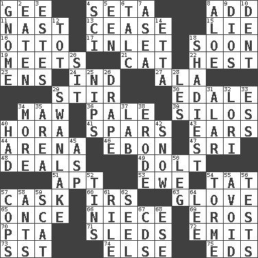 ACROSS 1. Turn to the right 4. Bristle 8. Increase 11. Political cartoonist Thomas 13. Desist 15. Untruth 16. "Beetle Bailey" pooch 17. An arm off of a larger body of water 18. Within a short period 19. Confronts 21. Feline 22. Behest 23. Followers of ems 24. Indiana (abbr.) 27. Wing 29. Disorderly outburst 30. Peak District village in England 34. Opening into something insatiable 36. Light colored 39. Grain storage towers 40. Israeli folk dance 41. Practice fights 43. Hearing organs 44. Sports stadium 46. Inky black, to poets 47. Indian title of respect (Mr.) 48. Allots cards 49. Stupid person 51. Fitting 53. She-sheep 54. Make lace 57. Keg 60. Big collection agency 63. Michael Jackson trademark 65. At one time in the past 66. Sibling's daughter 69. Greek god of love 70. Parent Teacher Assoc. 71. Bobsleighs 72. Give off 73. Fast jet (abbr.) 74. Otherwise 75. Begley and Asner DOWN 1. Dwarf 2. Consumed 3. _____ Park, CO 4. _-fi 5. Car or cant ending 6. Baby powder 7. At sea 8. Medicinal plant 9. "Vaya con ____" 10. Gouge 12. Small child 14. Singer James 18. Most questionable 20. Be seated 25. Cuts off 26. Window treatment 28. French article 29. Tchaikovsky ballet 31. Having or resembling wings 32. Australian parrot (variant) 33. Double-curved letter 34. Greater amount 35. Type of rug 37. Experiment locale 38. Eat (away) 40. Possessed 42. Frozen precipitation 45. Viper 50. Part of a journey 52. Canisters 54. Singer Mel 55. Shun 56. Trials 57. 911 reaches them 58. Pismires 59. Jazz singing style 61. Cause heat under the collar 62. Stitch closed the eyes of (a falcon) 64. Area sheltered from the wind 67. Music discs 68. Compass dir.
