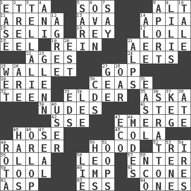 ACROSS 1. Singer James 5. Distress signal 8. Keyboard modifier key 11. Sports stadium 13. Actress Gardner 14. Capital of Western Samoa 15. Former Milwaukee Brewers owner Bud 16. Marina Del _, California 17. Hang loosely or laxly 18. Snakelike fish 19. It's straight from the horse's mouth 21. Nest on high 22. Eons 24. Allows 25. Place for singles 27. Republican Party 29. One of the Great Lakes 30. Desist 32. Adolescent 33. A person who is older than you are 35. "____ silly question..." 39. Unclothed pictures 41. Proofreading order 42. Compass dir. 43. Develop 45. Flexible conduit 48. Root beer relative 49. More uncommon 50. Parka part 52. Three (prefix) 55. Spanish pot 56. Lion 57. Keyboard key 59. Implement 60. Mischievous child 61. Biscuitlike quick bread 62. Cleo's killer 63. Double-curved letter 64. Singles DOWN 1. Relaxation 2. Relationship diagram 3. Copy Pinocchio 4. Black tropical American cuckoo 5. Indian skirt 6. Baking chamber 7. Declare 8. To the left, to Queeg 9. Ms. Damita and namesakes 10. Falsehood 12. Match 14. Toward shelter 20. Eastern Standard Time (abbr.) 21. High mountains 23. American astronaut and politician John 25. Soggy 26. "We ___ not amused" (Victoria) 27. Turn to the right 28. Boat paddle 30. Music discs 31. Artist's stand 33. Begley and Asner 34. Area sheltered from the wind 36. Ski resort town in Vermont 37. Barrel 38. Had dinner 40. One who uses or employs something 43. Environmental prefix 44. Methods 45. Rings 46. Lowest deck of a ship 47. Lick closed 49. Round or rotation of duties 50. Folds over and sews together 51. I made a mistake 53. French philosopher Descartes 54. Angers 56. Untruth 58. Non-commissioned officer (abbr.)