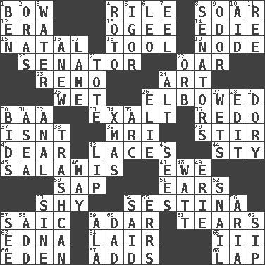 ACROSS 1. Ribbon knot 4. Cause heat under the collar 8. Fly high 12. Epoch 13. Double curve, resembling the letter S 14. Singer Brickell 15. Brizilian seaport 18. Instrument 19. Thickened enlargement 20. Elected representative 22. Rowing implement 23. San ____ (Riviera town) 24. Nonscientific branch of learning 25. Soggy 26. Turned at an angle; bent 30. Sound made by sheep 33. Glorify 36. Make new 37. Is not 39. Medical imaging device (abbr.) 40. Commotion 41. Letter starter 42. Shoestrings 44. Filthy place 45. Deli grouping 47. She-sheep 50. Plant excrement 51. Hearing organs 53. Like a shrinking violet 54. French poetic form 57. Ketch in the Levant 59. The sixth month of the Jewish calendar 61. Pulls apart 63. Pulitzer Prize-winning author Ferber 64. Den 65. One more than two 66. Paradise 67. Sums up 68. Infant locale DOWN 1. Benjamin's nick name 2. Mouths or openings 3. Wetness 4. Printing process, for short 5. Russian composer Stravinsky 6. Lion 7. Snakelike fish 8. Elected representatives 9. Aroma 10. Help 11. To separate or throw off 16. Afresh 17. Unable to walk 21. Carryall 22. Globe 24. Keyboard modifier key 26. Writer Wiesel 27. Soaks 28. Prepare for publication 29. Small, narrow, flatbottom fishing boat 30. Auction offers 31. At sea 32. Of or related to the anus 34. Dec. holiday 35. Curve 38. File 13 42. Mouth edge 43. Perceives with the eye 46. Fifth month 48. Electrical Unit 49. 4th largest of the Great Lakes 52. Slow-paced one 53. Trig term 54. Alleged 55. Blunders 56. Roberta Peters solo 57. Observe 58. Increase 59. Chicken ___ king 60. June honoree 62. Small drink