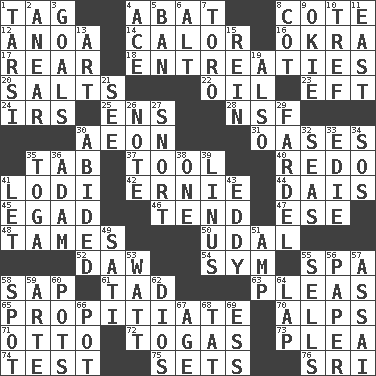 ACROSS 1. Label 4. Blind as ____ 8. ____ d'Azur (French Riviera) 12. Small Philippine buffalo 14. Bodily heat indicating an inflammation 16. Gumbo ingredient 17. Stern 18. Pleas 20. Table seasonings 22. Lubricate 23. Lizard (obsolete) 24. Big collection agency 25. Followers of ems 28. Science/research agcy. 30. A really long time 31. Fertile tracts in a desert 35. Bar bill 37. Implement 40. Make new 41. Farming town in central California 42. Bert's buddy 44. Raised platform 45. Mild oath 46. Watch over 47. Compass dir. 48. Makes less strong or intense 50. Freehold land 52. Obsolete 54. Symbol (abbr.) 55. Health resort 58. Plant excrement 61. Small amount or degree 63. Entreaties 65. Conciliate 70. High mountains 71. "Beetle Bailey" pooch 72. Ancient Roman robes 73. Entreaty 74. Trial 75. Arranges properly for use 76. Indian title of respect (Mr.) DOWN 1. Tarsus (plural) 2. Approach 3. Finish lines 4. Adept person 5. Prohibit 6. Keyboard modifier key 7. "Corrida" creature 8. Small bed 9. Migrant worker of the '30s 10. Unclean, religiously 11. 90 degrees 13. Tate display 15. It's straight from the horse's mouth 19. In addition 21. Perceive with the eye 26. Observe 27. Derisive sound 29. Bundle 30. Tolerated 32. Oceans 33. Singer Brickell 34. Mayday 35. Ancient Roman robe 36. First man 38. Single 39. "_ and Lucy" (Charlie Brown theme song) 41. Allow 43. Whirlpool 49. Suttee (variant) 51. Electrical Unit 53. Electrical Unit 55. Makes a sale 56. Some stationery 57. Slender Brazilian palm 58. Specific locale 59. Johnson of "Laugh-In" 60. Cooking vessels 62. "Vaya con ____" 64. Pet locale 66. Cooking vessel 67. Ripen 68. Make lace 69. Curvy letter