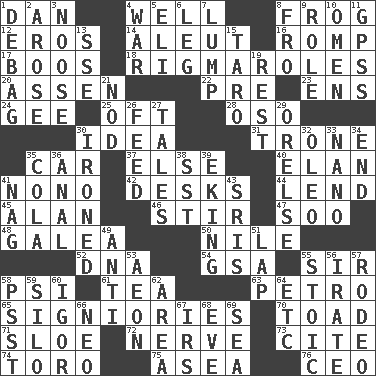 ACROSS 1. One of the 12 tribes of Israel 4. Not ill 8. Toadlike animal 12. Greek god of love 14. Native American of Southwest Alaska 16. Play 17. Scornful sounds 18. Complicated, petty procedures 20. NE Netherlands city 22. Before (prefix) 23. Followers of ems 24. Unit of force equal to gravity 25. Often (poetically) 28. Bear (Spanish) 30. The content of cognition 31. Heavy duty weighing machine 35. Auto 37. Otherwise 40. Enthusiasm 41. Words to Nanette 42. Writing tables 44. Grant temporary use of 45. ____ Jay Lerner 46. Use a swizzle stick 47. "Barney Miller" actor Jack 48. An organ shaped like a helmet 50. "Death on the ____" 52. Heredity factor (abbr.) 54. Girls' org. (abbr.) 55. Title for a knight 58. 23rd letter of the Greek alphabet 61. Beverage made from leaves 63. Stone: prefix 65. Seigniories (variant) 70. Frog relative 71. _ gin 72. Boldness 73. Quote 74. "Corrida" creature 75. Toward the sea 76. Corporate head (abbr.) DOWN 1. Debunk (Brit. slang) 2. Came up 3. Trap for birds or small mammals 4. Armed conflict 5. Biblical high priest 6. Part of a journey 7. Mass 8. From 9. Hero or heavy, e.g. 10. Presage 11. Global Positioning Systems (abbr.) 13. Compass dir. 15. Pacific island yam 19. Respite 21. Dreamland 26. Nourish 27. Stories 29. Threatening words 30. Pressed 32. Butter sub 33. Billionth: prefix 34. Conclude 35. Root beer relative 36. Of or related to the anus 38. Fast jet (abbr.) 39. Supplementing with great effort 41. Tired old horse 43. Indian titles of respect 49. Opposed to 51. Pet locale 53. Period of immesurable duration 55. Unemotional 56. Feeling or showing extreme anger 57. Cowboy competition 58. Inconspicuous attention getter 59. Grain storage tower 60. Russian composer Stravinsky 62. Length times width 64. And so on (abbr.) 66. Modern: prefix 67. Big collection agency 68. Night before a holiday 69. Ocean