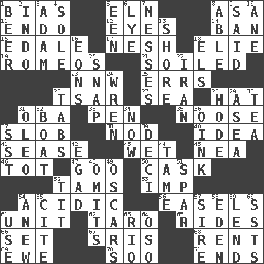 ACROSS 1. Prejudice 5. Shade tree 8. White ___ sheet 11. Inside; within (prefix) 12. Snake ____ (dice throw) 14. Forbid 15. Peak District village in England 17. Tender 18. Writer Wiesel 19. Lover boys 21. Dirtied 23. Compass dir. 25. Blunders 26. Russian ruler of old 27. Ocean 28. Floor covering 31. Chief or king in Benin or Nigeria 33. Fenced enclosure 35. Trap for birds or small mammals 37. Messy guy 38. Dreamland 40. It may be bright or harebrained 41. Gospel singer Marvin 43. Dripping 45. Teachers' org. 46. Small child 47. Thick or sticky substance 50. Keg 52. Scottish caps 53. Mischievous child 54. Being or containing an acid 56. Artist's stands 61. A single undivided whole 62. Pacific island yam 65. Amusement-park features 66. Arrange properly for use 67. Indian titles of respect 68. Monthly bill 69. She-sheep 70. "Barney Miller" actor Jack 71. Conclusions DOWN 1. Fermented drink made from hops 2. Southeast Asian peninsula 3. First of billions? 4. Flatfish 5. Car or cant ending 6. Potassium hydroxide 7. Makes clutter 8. Competent 9. Stated 10. One (Scot) 13. Dinah or Pauly 16. Immeasurably long periods of time 18. Raised railways 20. Fastener 22. SW Asia republic 24. Songbird 26. Bar bills 28. Method 29. Toward the sea 30. Afternoon social gathering 31. Margarine 32. Water vessel 34. Immediately 36. Pig sound 37. Fast jet (abbr.) 39. Tenth: prefix 42. Mild oath 44. Not wild 48. Leaves out 49. Motion picture awards 51. Coast Guard woman 52. Teat (slang) 54. Afresh 55. Quote 57. Beget 58. Paradise 59. Grant temporary use of 60. Fast planes 61. Purpose 63. River (Sp.) 64. Bear (Spanish)
