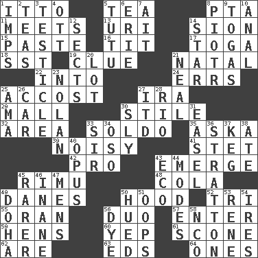 ACROSS 1. "Tell ____ the Marines!" 5. Beverage made from leaves 8. Parent Teacher Association (abbr.) 11. Confronts 13. RI univ. 14. The Jewish people; Israel 15. Thick mixture 16. Teat (slang) 17. Ancient Roman robe 18. Fast jet (abbr.) 19. A slight indication 21. Relating to or accompanying birth 22. To the inside or interior of 24. Blunders 25. Buttonhole 27. Retirement account (abbr.) 29. Promenade 30. Vertical member of a panel or frame 32. Length times width 33. Twentieth part of a lira 35. "____ silly question..." 39. Annoyingly loud 41. Proofreading order 42. Adept person 43. Develop 45. Tall New Zealand timber tree 48. Root beer relative 49. Natives or inhabitants of Denmark 50. Parka part 52. Three (prefix) 55. Northwest Algerian city 56. Superhero pair 57. Keyboard key 59. Coop moms 60. Slangy assent 61. Biscuitlike quick bread 62. "We ___ not amused" (Victoria) 63. Begley and Asner 64. Singles DOWN 1. Naughty children 2. Beverages made from leaves 3. One of the two male reproductive glands 4. Baseball player Mel 5. Ballerina skirt 6. 4th largest of the Great Lakes 7. Small island 8. Peter (Polish) 9. Ancient Roman robes 10. Of or related to the anus 12. Religious groups 14. Play the lead 20. Car dealer's back yard 21. Be tempered by heat 23. Pitcher Ryan 25. Nursemaid (var.) 26. Automobile 27. It would 28. River (Sp.) 30. Mischievous 31. Artist's stand 33. Title for a knight 34. Bear (Spanish) 36. Ski resort town in Vermont 37. Barrel 38. Had dinner 40. Musical composition 43. Environmental prefix 44. Methods 45. Less widely known 46. Lacking in sense or substance 47. Not women's 49. Capital of the state of Qatar 50. Took on color 51. I made a mistake 53. French philosopher Descartes 54. Angers 56. Color 58. Non-commissioned officer (abbr.)