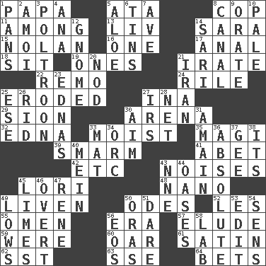 ACROSS 1. Dad 5. "One Day ___ Time" 8. Police officer (slang) 11. Amid 13. 54 in ancient Rome 14. "Two Mules for Sister ____" 15. Pitcher Ryan 16. Single 17. Of or related to the anus 18. Be seated 19. Washington bills 21. Feeling or showing extreme anger 22. San ____ (Riviera town) 24. Cause heat under the collar 25. Eaten away 27. _ tizzy (2 wds.) 29. The Jewish people; Israel 30. Sports stadium 32. Pulitzer Prize-winning author Ferber 33. Damp 35. Wise men 39. Excessive but superficial compliments 41. Collude with 42. And so on (abbr.) 43. Annoying sounds 45. Australian parrot (variant) 48. Billionth: prefix 49. Make or become more lively 50. Lyric poems 52. French article 55. Presage 56. Period 57. Evade 59. We are 60. Rowing implement 61. Smooth fabric 62. Fast jet (abbr.) 63. Compass dir. 64. Antes DOWN 1. Baking dishes 2. Mine, in Marseilles 3. Characterized by complete cowardliness 4. Santa ___, CA 5. Medicinal plant 6. Canisters 7. "___ Maria" 8. Lessep's creation 9. Speak pompously 10. Diluted with white 12. Dwarf 14. Indian skirt 20. Allow head to fall sleepily 21. SW Asia republic 23. Ferber et al. 25. Compass dir. 26. To free from 27. Big collection agency 28. Remaining after all deductions 30. Direct toward a target or goal 31. With great haste 33. Floor protector 34. The grampus (Milton) 36. Utter; complete 37. Unit of force equal to gravity 38. ___ a Wonderful Life 40. Chow _ 43. Compass dir. 44. Fertile tracts in a desert 45. Citrus fruits 46. Unconcealed 47. French philosopher Descartes 49. Coldest temperatures 50. Mouths or openings 51. Have the gumption 53. Prepare for publication 54. Elected reps. 56. Greek goddess of the dawn 58. Experiment locale
