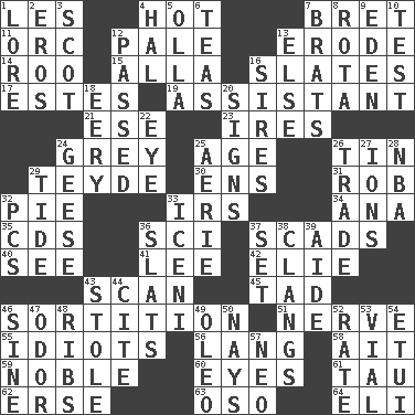 ACROSS 1. French article 4. Being at a high temperature 7. Cy Young winner Saberhagen 11. The grampus (Milton) 12. Diluted with white 13. Eat (away) 14. Friend of Pooh 15. Silent film actress Nazimova 16. Chalkboards 17. _____ Park, CO 19. Aide 21. Compass dir. 23. Angers 24. Jennifer or Joel 25. Ripen 26. Shallow baking pan 29. Miss Universe 1986, Barbara Palacios _ 30. Followers of ems 31. Director Reiner 32. Sliced dessert 33. Big collection agency 34. Santa ___, CA 35. Music discs 36. _-fi 37. Large numbers or amounts 40. Observe 41. Area sheltered from the wind 42. Writer Wiesel 43. Examine hastily 45. Small boy 46. Drawing lots 51. Boldness 55. Foolish or stupid persons 56. Austrian-born American filmmaker Fritz 58. Small island 59. Impressive in appearance 60. Sight organs 61. The 19th letter of the Greek alphabet 62. Celtic language 63. Bear (Spanish) 64. Biblical high priest DOWN 1. Old wives' tales, e.g. 2. Greek god of love 3. Highlander 4. Actor Linden 5. Water jar 6. Afternoon social gatherings 7. Naughty children 8. Roll call or roster of names 9. Genesis locale 10. Trial 12. Went by 13. Otherwise 16. Fathers 18. Suggestive of the supernatural 20. Omens 22. Sight organ 24. Honkers 25. Nest on high 26. Barter 27. Charged atoms 28. Basketball assoc. 29. Periodic rise and fall of the sea level 32. Personal Computers (abbr.) 33. Ancient Celtic tribe of eastern Britain 36. Narrow boards 37. Arrange properly for use 38. Rings loudly 39. Assistant 43. Took without asking 44. Quote 46. Trig term 47. Aroma 48. Chest bones 49. Margarine 50. Negative votes 52. Assign a rank or rating to 53. Small bottle 54. Needle holder 57. Modern: prefix