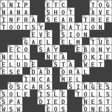 ACROSS 1. Clip 5. And so on (abbr.) 8. Coat; cloak 11. Grandmother 12. Guess 14. "___ Maria" 15. Kind of red light 17. Singe 18. Woody plant 19. Tootsie (variant) 21. Food allowance for one day 23. Night before a holiday 25. The Jewish people; Israel 26. Highlander 27. Shade tree 28. Third day of the wk. 31. Environmental prefix 33. Declare 35. Dark wood 37. 1994 drama film starring Jodie Foster 38. Teachers' org. 40. Migrant worker of the '30s 41. Evade 43. R.R. building 45. Dripping 46. Compass dir. 47. Male parent 50. Of the mouth 52. South American Indian 53. Cartoonist voice _ Blanc 54. Motion picture awards 56. Scorches 61. Flatfish 62. Small island 65. For Whom the Bell _____ 66. Health resort 67. Passed on 68. Egg locale 69. Compass dir. 70. Greek goddess of the dawn 71. Singles DOWN 1. In a ____ (agitated or irritated) 2. Billionth: prefix 3. Information 4. Role in a play 5. Double-curved letter 6. Definite Article 7. Unrefined 8. Pacific island yam 9. Baking chamber 10. Unit of force equal to gravity 13. Hang back 16. At sea 18. Shallow baking pan 20. Jacques Cousteau's middle name 22. Heavy book 24. Enthusiasm 26. Gilt 28. Casino tip 29. A single undivided whole 30. Sight organ 31. Snakelike fish 32. A slight indication 34. It is so 36. Soup holder 37. Born 39. Tiny particle 42. Pulitzer Prize-winning author Ferber 44. Ancient Greek god of war 48. Sour-tasting 49. Hyrax 51. Came down and settled, as after flight 52. Frozen water 54. I made a mistake 55. Cole _ (cabbage dish) 57. Words to Nanette 58. Small, secluded valley 59. Otherwise 60. Fast planes 61. Compass dir. 63. Lion 64. Begley and Asner