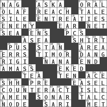 ACROSS 1. Tired old horse 4. "____ silly question..." 8. Relating to the mouth 12. Norwegian king 14. Arrive at 16. Story 17. Drop; flow; fall 18. Pleas 20. Foe 22. Hearing organ 23. Remaining after all deductions 24. Ocean 25. Followers of ems 28. Personal Computers (abbr.) 30. Toward the sea 31. Chest covering 35. Product of festering 37. Comedian Laurel of Laurel & Hardy 40. Length times width 41. Blunders 42. The easternmost of the Lesser Sundas 44. Mild oath, euphamism for damn 45. Swiss mountan, "Queen of the Mountains" 46. Grandmother 47. Conclude 48. Collect or gather 50. Made supply last 52. Afternoon social gathering 54. "___ Little Indians" 55. Adept person 58. Quiet! 61. Before (prefix) 63. Artist's stand 65. Frustrate 70. Capri or Wight 71. So be it 72. Underwater navigation system 73. Baby powder 74. Thickened enlargement 75. Indian skirt 76. Was introduced to DOWN 1. Olfactory organs 2. Place in a line 3. An organ shaped like a helmet 4. "We ___ not amused" (Victoria) 5. Elected rep. 6. Krazy ___ of comics 7. 43,560 square feet 8. Baseball player Mel 9. Precipitation 10. Toward shelter 11. For fear that 13. Opposite of masc. 15. Pile 19. Arches 21. It is so 26. Egg locale 27. Smooth fabric 29. Cast a shadow over 30. Help 32. SW Asia republic 33. Tear apart 34. Label 35. Demure 36. Capital and largest city of Mongolia 38. Housemaid (var.) 39. Music written for nine 41. Epoch 43. Libertine 49. Back-to-school mo. 51. Compass dir. 53. Ancient Greek god of war 55. Indian state 56. Cell (Danish) 57. Voters do this 58. Skim 59. Same (prefix) 60. Became colored 62. Greek god of love 64. Small island 66. Compass dir. 67. Santa ___, CA 68. Automobile 69. Three (prefix)