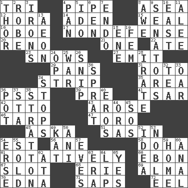 ACROSS 1. Three (prefix) 4. Corncob 8. At sea 12. Israeli folk dance 14. An important port of Yemen 15. Welt 16. Mitch Miller's instrument 17. Unrelated to defense, as in spending 20. Former U.S. Attorney General Janet 21. Single 22. Had dinner 23. Frozen precipitation (plural) 27. Give off 29. Zero-star reviews 31. Printing process, for short 34. Empty completely 35. Type of rug 36. Inconspicuous attention getter 39. Before (prefix) 41. Russian ruler of old 42. Von Bismarck 43. Came up 46. Canvas cover 47. "Corrida" creature 48. "____ silly question..." 51. Indian antelope 54. Eastern Standard Time (abbr.) 56. One (Scot) 58. Capital of the state of Qatar 61. Producing rotation 66. Inky black, to poets 67. Groove 68. One of the Great Lakes 69. _ mater 70. Pulitzer Prize-winning author Ferber 71. Plant excrements 72. Snakelike fish DOWN 1. Son of Odin 2. Loose flowing garment 3. Metal shackles 4. Baking dish 5. Wedding promise 6. Fenced enclosure 7. Inside; within (prefix) 8. Deep reverence 9. Legislators 10. Compass direction 11. Toward shelter 13. Period of immesurable duration 18. Compass dir. 19. Opposite of masc. 24. Choose 25. Armed conflict 26. Clip 28. Feeling or showing extreme anger 30. Small fatty European fish 32. Afternoon social gathering 33. Boat paddle 34. Ceases 36. Cooking vessel 37. R.R. building 38. Ski resort town in Vermont 40. Greek god of love 44. Mouth or opening 45. Distress signal 49. Krazy ___ of comics 50. Black tropical American cuckoo 52. The content of cognition 53. Having high moral qualities 54. Celtic language 55. Exchanged or delivered for money 57. Nights before holidays 59. Dwelling 60. Of or related to the anus 62. "One Day ___ Time" 63. Epoch 64. Mouth edge 65. It is so