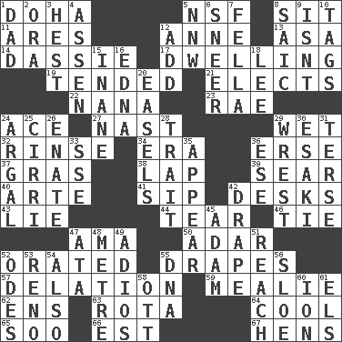 ACROSS 1. Capital of the state of Qatar 5. Science/research agcy. 8. Be seated 11. Ancient Greek god of war 12. Queen of England 1702-14 13. White ___ sheet 14. Hyrax 17. Home 19. Looked after 21. Opts 22. Nanny 23. Actress Charlotte 24. Adept person 27. Political cartoonist Thomas 29. Dripping 32. Wash lightly 34. Epoch 36. Celtic language 37. Pate de foie ____ 38. Infant locale 39. Shrivel 40. Johnson of "Laugh-In" 41. Small drink 42. Writing tables 43. Untruth 44. Lacerate 46. Make a knot 47. Nursemaid (var.) 50. The sixth month of the Jewish calendar 52. Declaimed 55. Window treatments 57. Conveyance 59. Ear of corn 62. Followers of ems 63. Roll call or roster of names 64. Calm and collected 65. "Barney Miller" actor Jack 66. Eastern Standard Time (abbr.) 67. Coop moms DOWN 1. June honoree 2. Mouth or opening 3. Command 4. NE Netherlands city 5. Compass dir. 6. Contemptuous expression 7. Chap (slang) 8. Ketch in the Levant 9. Is not 10. Labels 12. Find the sum of 15. Empty; void 16. Pulitzer Prize-winning author Ferber 18. Area sheltered from the wind 20. Artist's stands 24. Therefore, facetiously 25. High-altitude cloud 26. Maternal 28. Distinguishing feature 29. Take or capture by force 30. 1973 Nobel Price Winner (Physics) Leo 31. Laconic 33. Compass dir. 35. Become visible 36. Compass dir. 42. Window treatment 45. First man 47. _ moment's notice (2 wds.) 48. Distance measurement (Brit.) 49. Goodbye (Sp.) 51. Arrive at 52. Lyric poems 53. Former U.S. Attorney General Janet 54. In addition 55. Heredity factor (abbr.) 56. _ gin 58. Baseball player Mel 60. Electrically charged atom 61. Raised railways