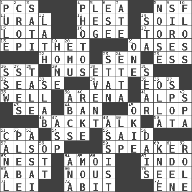 ACROSS 1. Personal Computers (abbr.) 4. Entreaty 8. Science/research agcy. 11. Mountain range 13. Behest 14. Land 15. Globular water bottle used in Asia 16. Double curve, resembling the letter S 17. "Corrida" creature 18. Curse 21. Fertile tracts in a desert 22. Like (prefix) 23. Elected rep. 25. Curvy letter 26. Fast jet (abbr.) 29. French bagpipes 32. Gospel singer Marvin 34. Large container 35. Greek goddess of the dawn 38. Not ill 39. Sports stadium 41. High mountains 43. Ocean 44. Prohibit 45. Fourth or lowest deck 46. Sass 50. "One Day ___ Time" 51. Accounting whiz (abbr.) 54. Compass dir. 55. Expressed in words 57. Columnist Joseph or Stewart 59. Orator 63. A home for chicks 64. Mine, in Marseilles 67. Southeast Asian peninsula 68. Blind as ____ 69. Horse sense 70. Stitch closed the eyes of (a falcon) 71. Flowery wreath 72. "This won't hurt ____!" 73. Compass dir. DOWN 1. Whimper 2. Riding implement 3. Suttee (variant) 4. Pictures 5. Part of a journey 6. Compass dir. 7. Had dinner 8. Trap for birds or small mammals 9. Male parents of animals 10. Soft thread for cleaning between teeth 12. Thin strip of wood or metal 14. R.R. building 19. Dwelling 20. Australian flightless bird 21. Single 23. Comedian Laurel of Laurel & Hardy 24. Singer James 26. Compass dir. 27. Observes 28. Falsehood 30. Incident 31. Scorch 33. Thick slice 36. Spanish pot 37. Specific locale 39. Lettered men learn these first 40. Immoral or dissolute person 42. Health resort 45. Migrant worker of the '30s 47. Viper 48. Help 49. Infant locale 51. Lessep's creation 52. Military trainee 53. Slender Brazilian palm 56. Raised platform 58. Baseball player Mel 60. Leg joint 61. Genesis locale 62. Hero or heavy, e.g. 64. Santa ___, CA 65. Disorderly crowd 66. Fr. "Yes"