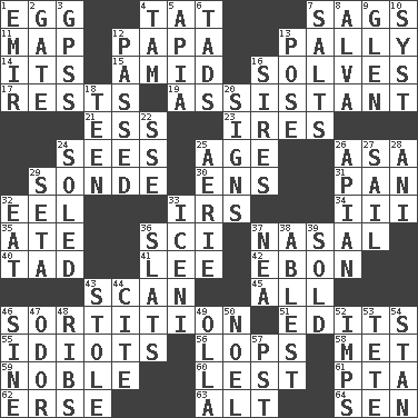 ACROSS 1. Oval reproductive body of a fowl 4. Make lace 7. Sinks 11. Atlas unit 12. Dad 13. Chummy 14. It is 15. Among 16. Finds the solution 17. Musical pauses 19. Aide 21. Double-curved letter 23. Angers 24. Observes 25. Grow older 26. White ___ sheet 29. Message 30. Followers of ems 31. Baking dish 32. Snakelike fish 33. Big collection agency 34. One more than two 35. Had dinner 36. _-fi 37. Rhinal 40. Small amount or degree 41. Area sheltered from the wind 42. Inky black, to poets 43. Examine hastily 45. 100% 46. Conclusion 51. Prepares for publication 55. Foolish or stupid persons 56. Chops off 58. Was introduced to 59. Having high moral qualities 60. For fear that 61. Parent Teacher Association (abbr.) 62. Celtic language 63. The first octave above the treble staff 64. Elected rep. DOWN 1. Arab leader 2. Yard entry 3. Global Positioning Systems (abbr.) 4. Scottish cap 5. Capital of Western Samoa 6. Small amounts or degrees 7. Table seasonings 8. Inventor's middle name 9. Small, secluded valley 10. System (abbr.) 12. Went by 13. Introduce or present, as a question 16. Male parents of animals 18. Adolescent 20. Attaches a signature 22. Compass dir. 24. Having a sole or soles 25. Nest on high 26. Bee-related 27. Move on water 28. Cuckoo 29. Stalk of a moss capsule 32. Ingest 33. Ancient Celtic tribe of eastern Britain 36. Narrow boards 37. Teachers' org. 38. Most capable 39. Exchanged or delivered for money 43. Fur scarf 44. Quote 46. Trig term 47. Aroma 48. Chest bones 49. Spanish pot 50. Christmas carol 52. Naughty children 53. Wig 54. Comedian Laurel of Laurel & Hardy 57. Pacific Standard Time (abbr.)