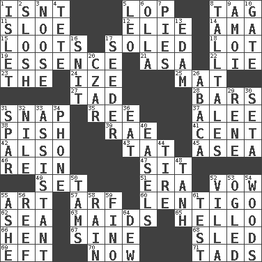 ACROSS 1. Is not 5. Trim (branches) 8. Label 11. A type of plum 12. Writer Wiesel 14. Housemaid (var.) 15. Plunders 17. Having a sole or soles 18. Car dealer's back yard 19. Center 21. White ___ sheet 22. Untruth 23. Definite Article 24. Ending with capital 25. Floor protector 27. Small amount or degree 28. Drinking establishments 31. Fastener 35. To riddle 37. Toward shelter 38. Expression of disdain 39. Actress Charlotte 41. Penny 42. In addition 43. Make lace 45. Toward the sea 46. It's straight from the horse's mouth 47. Be seated 49. Put into a specified state 51. Epoch 52. Promise 55. Tate display 57. Sandy's bark 60. Small, flat, pigmented spot on the skin 62. Ocean 63. Women servants 65. Phone greeting 66. Layer 67. Trig term 68. Downhill vehicle 69. Lizard (obsolete) 70. At this time 71. Small amounts or degrees DOWN 1. Small island 2. Splash clumsily 3. Trap for birds or small mammals 4. Wig 5. Lion 6. Spanish pot 7. Sliced desserts 8. Baron Munchausen's specialties 9. Mine, in Marseilles 10. Yard entry 13. Dutch treat 16. In a ____ (agitated or irritated) 17. Sowing specialist 20. Russian ruler of old 26. Phillipine bananalike plant 29. French philosopher Descartes 30. Stalk of a moss capsule 31. Practice fight 32. The longest river in the world 33. Aide 34. Give a jingle 36. Erode 40. Artist's stands 44. Hoop that covers a wheel 48. Hyperbolic tangent 50. Scottish caps 52. Country residence 53. Stared 54. Forest 55. American tennis player Robert 56. Coral ridge 58. Precipitation 59. A pale, very dry sherry 61. Trial 64. Morning condensation