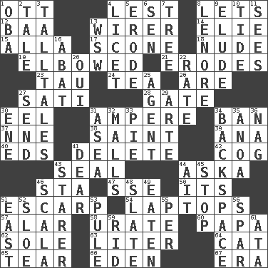 ACROSS 1. Baseball player Mel 4. For fear that 8. Allows 12. Sound made by sheep 13. One who wires 14. Writer Wiesel 15. Silent film actress Nazimova 17. Biscuitlike quick bread 18. Naked 19. Shoved, as through a crowd 21. Eats (away) 23. The 19th letter of the Greek alphabet 24. Beverage made from leaves 26. "We ___ not amused" (Victoria) 27. Suttee (variant) 28. Yard entry 30. Snakelike fish 31. Electrical Unit 34. Bar 37. Compass dir. 38. Inhabitant of Heaven 39. Santa ___, CA 40. Begley and Asner 41. Erase 42. Gear tooth 43. Lick closed 44. "____ silly question..." 46. R.R. building 47. Compass dir. 50. ___ a Wonderful Life 51. Fortification 54. Portable computers 57. Having or resembling wings 58. A salt of uric acid 60. Dad 62. Not divided or shared with others 63. 61 cubic inches 64. Domesticated feline 65. Separate forcefully 66. Locale of original sin 67. Epoch DOWN 1. Chief or king in Benin or Nigeria 2. Lie 3. Baron Munchausen's specialties 4. It is permitted: Lat. 5. Eat (away) 6. Elected rep. 7. Relationship diagram 8. Poe poem 9. Evade 10. Periodic rise and fall of the sea level 11. Perceives with the eye 13. Compass dir. 16. Blind as ____ 20. Fr. "Yes" 22. Pace 25. Rep 27. Post 29. Johnson of "Laugh-In" 30. Compass dir. 31. Toward the sea 32. Promenades 33. Sliced dessert 34. Keyboard key 35. Small Philippine buffalo 36. Tired old horse 41. Letter starter 43. A viewer who gazes fixedly 44. Small island 45. Close up, plug up 46. Any of the three canals of the cochlea 48. Schedule 49. Ingested 51. Compass direction 52. _ gin 53. Whine 55. For each 56. Practice fight 59. To free from 61. "One Day ___ Time"