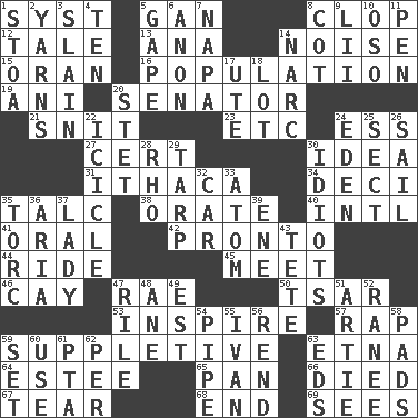 ACROSS 1. System (abbr.) 5. Separate the seeds from cotton 8. Hoof sound 12. Lie 13. Santa ___, CA 14. Annoying sound 15. NW Algerian seaport 16. Census information 19. Black tropical American cuckoo 20. Legislator 21. In a ____ (agitated or irritated) 23. And so on (abbr.) 24. Double-curved letter 27. Certainty 30. The content of cognition 31. New York city 34. Tenth: prefix 35. Baby powder 38. Declaim 40. International (abbr.) 41. Taken by mouth 42. Right away 44. Travel on an animal 45. Confront 46. Island 47. Actress Charlotte 50. Russian ruler of old 53. Motivate 57. Reproach for some lapse or misdeed 59. Supplying deficiencies 63. Inactive volcano in Sicily 64. First name in cosmetics 65. Baking dish 66. Passed on 67. Pull into pieces 68. Conclusion 69. Observes DOWN 1. Portico 2. Entertaining tales 3. Killed 4. Nine, plus one 5. Open wide 6. Soon (poet.) 7. California wine valley 8. Small bed 9. Cards in a Roman deck? 10. Bear (Spanish) 11. Writing instrument 14. Drug cop 17. Shoshoni 18. Car dealer's back yard 20. Proofreading order 22. Hanging ice 24. Locale of original sin 25. Religious group 26. Travel by water 28. 17th letter of the Greek alphabet 29. Canvas cover 30. Foolish or stupid persons 32. 4-wheeled motor vehicle 33. Smallest unit of an element 35. Torque (variant) 36. Roberta Peters solo 37. Kenny Rogers chart-topper in '80 39. Compass dir. 43. Wig 47. Cause heat under the collar 48. A saturated hydrocarbon 49. Eastern Standard Time (abbr.) 51. Nick name for Arthur 52. Indian princess (variant) 54. Corncob 55. "Terrible" tsar 56. Tear apart 58. Writing tablets 59. Arrange properly for use 60. Purpose 61. Parent Teacher Association (abbr.) 62. For each 63. Begley and Asner