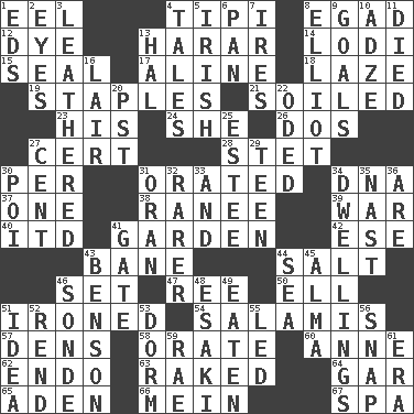 ACROSS 1. Snakelike fish 4. Native american tent (variation) 8. Mild oath 12. Color 13. Ethiopian city, capital of Harari 14. Farming town in central California 15. Lick closed 17. Place in a line 18. Goldbrick 19. Paper fasteners 21. Dirtied 23. Part of HMS, perhaps 24. A female animal or person 26. Two (Sp.) 27. An absolute certainty 28. Proofreading order 30. For each 31. Spoke pompously 34. Heredity factor (abbr.) 37. Single 38. Indian princess (variant) 39. Armed conflict 40. It would 41. Place where plants grow 42. Compass dir. 43. Object of repulsion 44. Table seasoning 46. Arrange properly for use 47. Portuguese money of account (variant) 50. Pipe bend 51. Pressed 54. Deli grouping 57. Cub Scout units 58. Declaim 60. Singer Murray 62. Inside; within (prefix) 63. Swept the length of 64. Slender fish 65. An important port of Yemen 66. Chow _ 67. Health resort DOWN 1. Begley and Asner 2. Snake ____ (dice throw) 3. Resembling or made to resemble leather 4. Stories 5. From or relating to Ireland 6. Baking dish 7. Angers 8. American author Paul (1891-1958) 9. Finish lines 10. Edge tool used to cut and shape wood 11. Passed on 13. Actor Linden 16. Den 20. Pacific Standard Time (abbr.) 22. Wrote a lyric poem 25. First name in cosmetics 27. Penny 29. Adolescent 30. Luau course 31. NW Algerian seaport 32. Less widely known 33. Added to 34. Homes 35. Political cartoonist Thomas 36. "We ___ not amused" (Victoria) 41. Yard entry 43. Gillaume's butler role 44. Ocean 45. _ mater 46. Something which is sent 48. 1973 Nobel Price Winner (Physics) Leo 49. Eroded 51. The main thing one is thinking about 52. Tear apart 53. Dormintory (informal) 55. Directed 56. Fastener 59. Actress Charlotte 61. Period
