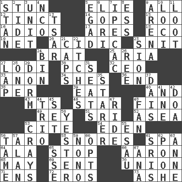 ACROSS 1. Astound 5. Writer Wiesel 9. Everything 12. A color or tint 14. Republicans 15. Friend of Pooh 16. Goodbye (Sp.) 17. Ancient Greek god of war 18. Environmental prefix 19. Fish or hair follower 20. Being or containing an acid 23. In a ____ (agitated or irritated) 24. Naughty child 25. Operatic vocal solo 27. Farming town in central California 30. Personal Computers (abbr.) 32. Corporate head (abbr.) 33. Soon (poet.) 34. "______ My Girl" (Turtles hit) 36. Conclusion 38. For each 39. Erode 40. Added to 43. Mountains (abbr.) 46. Play the lead 48. A pale, very dry sherry 49. Marina Del _, California 51. Indian title of respect (Mr.) 52. At sea 53. Quote 54. Genesis locale 56. Edible starchy tuberous root 58. Sounds asleep 61. Health resort 64. Insect wing 65. Obstruct or block passage 66. Composer Copland 68. Can I? 69. Transmitted 70. The state of being joined or united 71. Followers of ems 72. Greek god of love 73. American tennis player Robert DOWN 1. Comedian Laurel of Laurel & Hardy 2. Event that recurs at intervals 3. A single undivided whole 4. Non-commissioned officer (abbr.) 5. Mild oath 6. Australian parrot (variant) 7. Medicinal drug used to evoke vomiting 8. Double-curved letter 9. Sports stadium 10. Locales 11. Spoils 13. Russian ruler of old 21. Balmoral and tarboosh 22. Strong, restless desires 23. The Jewish people; Israel 24. Storage container 26. To riddle 27. Pet locale 28. Single 29. Dormintory (informal) 31. Theater features 35. A viewer who gazes fixedly 37. Raised platform 41. Compass dir. 42. ___ good deed 44. Musical group of three 45. Put into a specified state 47. Travel on an animal 48. Air blower 50. Last past 53. Trading vessels 55. He sold his birthright 56. Not wild 57. Actor Alda or Thicke 59. Words to Nanette 60. Chooses 61. Indian titles of respect 62. "Silly old bear" 63. Singer Murray 65. Compass dir. 67. Santa ___, CA