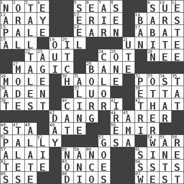 ACROSS 1. Make mention of 5. Oceans 9. Take to court 12. Like ___ of sunshine 13. One of the Great Lakes 14. Long, evenly shaped pieces 15. Diluted with white 16. Merit 17. Blind as ____ 18. Everything 19. Lubricate 21. Join together 22. Tense 24. Small bed 26. Born 27. Mysterious quality of enchantment 28. Object of repulsion 29. Undercover agent 30. White Person, in Hawaii 32. Mail 36. Arabian gulf 37. Nilotic language 38. Singer James 39. Trial 40. High-altitude cloud 42. Not this but _ 43. Mild oath, euphamism for damn 44. More valued for its uncommonness 46. R.R. building 49. Had dinner 50. Independent ruler or chieftain 51. Chummy 53. Girls' org. (abbr.) 54. Armed conflict 57. Jai ____ 58. Billionth: prefix 61. Trig term 62. False hair 63. At one time in the past 64. Fast planes 65. Compass dir. 66. "Vaya con ____" 67. Compass direction DOWN 1. California wine valley 2. Taken by mouth 3. Baron Munchausen's specialties 4. Sight organ 5. Sew up the eyelids of hawks and falcons 6. Epoch 7. Atmosphere 8. Elected rep. 9. Unit of acoustic absorption 10. A salt of uric acid 11. First name in cosmetics 14. Forbid 19. Fr. "Yes" 20. Hankering 21. Shoshoni 23. Representative 24. Bodily heat indicating an inflammation 25. Single 27. Method 28. French market town 29. Floor protector 31. Place in a line 32. _ dish (used to culture cells) 33. Else 34. Play the lead 35. Make lace 40. Domesticated feline 41. Angers 43. 24 hours 45. Housemaid (var.) 46. Arguments over trivial matters 47. Stories 48. Having winglike extensions 52. Falsehood 53. Travels 55. Pismires 56. State of inaction 58. Dreamland 59. Black tropical American cuckoo 60. Non-commissioned officer (abbr.) 61. Compass dir.