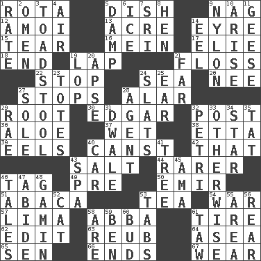 ACROSS 1. Round or rotation of duties 5. Food container 9. Tired old horse 12. Mine, in Marseilles 13. Land measure 14. Jane of fiction 15. Separate forcefully 16. Count _ (2 wds.) 17. Writer Wiesel 18. Conclude 19. Pet locale 21. Soft thread for cleaning between teeth 22. Cease 24. Ocean 26. Born 27. Closes up, plugs up 28. Having or resembling wings 29. Carrot, for example 30. _ Allan Poe 32. Mail 36. Medicinal plant 37. Soggy 38. Singer James 39. Snakelike fish 40. 2nd pers. sing. pres. of can (arch.) 42. Not this but _ 43. Table seasoning 44. More valued for its uncommonness 46. Label 49. Before (prefix) 50. Arab leader 51. Phillipine bananalike plant 53. Afternoon social gathering 54. Armed conflict 57. Pale green bean 58. Swedish rock group 61. Hoop that covers a wheel 62. Prepare for publication 63. Reuben's nickname 64. Toward the sea 65. Elected rep. 66. Extremities 67. Put on (as clothing) DOWN 1. Pace 2. Presage 3. Inedible or poisonous agaric 4. Wind 5. Moist 6. Frozen water 7. Indian title of respect (Mr.) 8. Layer 9. High-strength synthetic material 10. Originate 11. Honkers 14. Snakelike fish 19. Trim (branches) 20. Domed church section 21. At a great distance 23. Hauls 24. Narrow boards 25. Ewer handle 27. Not divided or shared with others 28. Representative 29. Actress Charlotte 31. A sleeping potion; an opiate (poet.) 32. _ dish (used to culture cells) 33. Else 34. Play the lead 35. Make lace 40. Automobile 41. Woody plant 43. Health resort 45. Wet nurse (var.) 46. Falsehoods 47. Stay 48. Homeless child 52. Domesticated feline 53. Bar bills 55. Type of rug 56. Hitchcock's "____ Window" 58. "We ___ not amused" (Victoria) 59. Benjamin's nick name 60. Partially opened flower 61. The 23rd letter of the Hebrew alphabet