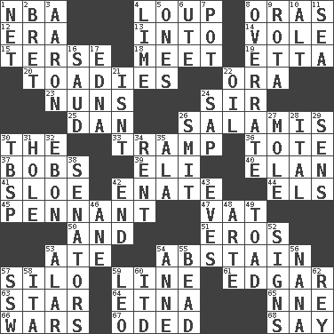 ACROSS 1. Basketball assoc. 4. Central Nebraska county 8. Mouths or openings 12. Period 13. To the inside or interior of 14. Grand slam 15. Laconic 18. Rendezvous 19. Singer James 20. Sycophants 22. Mouth or opening 23. Religious women 24. Title for a knight 25. One of the 12 tribes of Israel 26. Deli grouping 30. Definite Article 33. _____ steamer (cargo ship) 36. Lug 37. Moves up and down 39. Biblical high priest 40. Flair 41. _ gin 42. Maternal 44. Raised railways 45. Pre-World Series prize 47. Large container 50. Plus 51. Greek god of love 53. Had dinner 54. Refrain by choice 57. Grain storage tower 59. Actor's bit 61. _ Allan Poe 63. Play the lead 64. Inactive volcano in Sicily 65. Compass dir. 66. Armed conflicts 67. Wrote a lyric poem 68. Declare DOWN 1. Remaining after all deductions 2. Cy Young winner Saberhagen 3. Composer Copland 4. Citrus frut 5. Washington bills 6. Shoshoni 7. Cooking vessel 8. Make much ado about nothing 9. Round or rotation of duties 10. The first octave above the treble staff 11. Ocean 16. Saudi Arabian king (1953-1964) 17. Pulitzer Prize-winning author Ferber 21. Is not 22. Petroleum 24. Plant excrement 26. Stricken, poetically 27. Undercover agent 28. Slanted text style (abbr.) 29. Elected reps. 30. Cook's measure (abbr.) 31. Opening into or through something 32. Inky black, to poets 34. Monthly bill 35. In the manner of 38. Legislators 42. Conclude 43. Nights before holidays 46. A saturated hydrocarbon 48. Johnson of "Laugh-In" 49. Frog relative 52. Public displays of written messages 53. Having or resembling wings 54. Queen of England 1702-14 55. Necklace unit 56. Grandmother 57. Compass dir. 58. Call ___ day 59. Lion 60. It would 62. Marina Del _, California
