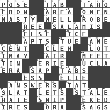ACROSS 1. Airs 5. Keyboard key 8. Pacific island yam 12. Inky black, to poets 13. Length times width 15. Sign of something about to happen 16. Offensive 18. Water source 19. Loose flowing garment 20. To separate or throw off 22. Deli grouping 24. Otherwise 26. Frozen water 27. Flats, for short 28. Third day of the wk. 29. A saturated hydrocarbon 32. Penny 35. Clement's nick name 37. Car dealer's back yard 38. "If ____ say so..." 39. Wind 40. Confront 41. Shallow baking pan 42. One of the Great Lakes 43. Southern CA. univ. 44. Period 45. Plant excrement 46. Bar bills 49. Double-curved letter 50. Writer Wiesel 51. Statements in reply to questions 55. Make lace 56. Narrow board 57. Allows 59. Having lost freshness 63. Pace 64. Sever or remove by pinching or nipping 65. Made supply last 66. Angers 67. Mouth or opening 68. Settles DOWN 1. Writing instrument 2. Chief or king in Benin or Nigeria 3. Mayday 4. Plea 5. The 23rd letter of the Hebrew alphabet 6. Ancient Greek god of war 7. Actor Lugosi 8. Singer Mel 9. Mine, in Marseilles 10. Confederate soldiers (slang) 11. Single 14. Plant genus of onion and garlic 17. Sharp bark 21. Eastern Standard Time (abbr.) 23. Adept person 25. Fortification 28. Cigar-shaped 29. Actor Baldwin 30. Christmas carol 31. Singer James 32. Quote 33. Arab leader 34. Nanny 36. Cards in a Roman deck? 40. French bagpipes 42. Artist's stands 45. Compass dir. 47. The first octave above the treble staff 48. Prejudice 49. _____ Park, CO 51. Having or resembling wings 52. Nathan's nickname 53. Western Nevada city 54. Agitate 56. _ Lanka 58. Health resort 60. Alias (abbr.) 61. Part of a journey 62. Begley and Asner