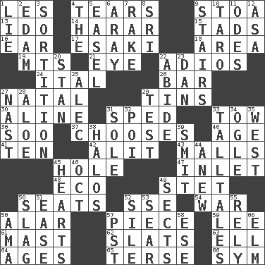 ACROSS 1. French article 4. Pulls into pieces 9. Portico 13. Wedding promise 14. Ethiopian city, capital of Harari 15. Small boys 16. Ewer handle 17. 1973 Nobel Price Winner (Physics) Leo 18. Type of rug 19. Mountains (abbr.) 21. Sight organ 22. Goodbye (Sp.) 24. Slanted text style (abbr.) 26. Tavern 27. Brizilian seaport 29. Metal containers 30. Place in a line 31. Broke a traffic law 33. Pull behind 36. "Barney Miller" actor Jack 37. Opts 40. Personal question 41. Nine, plus one 42. Set down 43. Shopping centers 45. Hollow 47. An arm off of a larger body of water 48. Environmental prefix 49. Proofreading order 50. Theater features 52. Compass dir. 54. Armed conflict 56. Having or resembling wings 57. Part 59. Area sheltered from the wind 61. Vertical spar for supporting sails 62. Narrow boards 63. Pipe bend 64. Eras 65. Laconic 66. Symbol (abbr.) DOWN 1. Falsehood 2. Dutch treat 3. Decision 4. Definite Article 5. Artist's stand 6. Like ___ of sunshine 7. Libertine 8. _ Lanka 9. Flight of steps 10. Pacific island yam 11. Lyric poems 12. White ___ sheet 20. Comedian Laurel of Laurel & Hardy 22. Tolerate 23. Daniel's nick name 25. Actor Baldwin 27. Political cartoonist Thomas 28. Medicinal plant 29. Trial 31. Not divided or shared with others 32. Luau course 33. Baron Munchausen's specialties 34. Stare at amorously 35. 270 degrees 38. Radiant circles of light 39. Stricken, poetically 44. Afresh 45. Centers of feelings and intuitions 46. Sep. follower 49. Religious groups 50. Volcanic refuse 51. Relaxation 52. Drop; flow; fall 53. Scorch 55. Have trust in 56. Wet nurse (var.) 57. Pacific Standard Time (abbr.) 58. Compass dir. 60. Shade tree