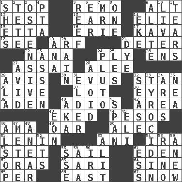 ACROSS 1. Halt 5. San ____ (Riviera town) 9. The first octave above the treble staff 12. Command 13. Merit 14. Writer Wiesel 15. Singer James 16. One of the Great Lakes 17. Polynesian shrub of the pepper family 18. Observe 19. Sandy's bark 21. Prevent from occurring 22. Nanny 24. Apply oneself diligently 26. Followers of ems 27. Slender Brazilian palm 28. Toward shelter 29. Advice 30. Mole, birthmark 32. Comedian Laurel of Laurel & Hardy 36. Moving, as bait 37. Car dealer's back yard 38. Jane of fiction 39. An important port of Yemen 40. Goodbye (Sp.) 42. Type of rug 43. Made supply last 44. Mexican monetary units 46. Nanny (var.) 49. Boat paddle 50. Actor Baldwin 51. Soviet premier 1918-24 53. Cuckoo 54. Retirement account (abbr.) 57. Proofreading order 58. Travel by water 61. Locale of original sin 62. Mouths or openings 63. Indian skirt 64. Trig term 65. For each 66. Compass direction 67. Overwhelm DOWN 1. "______ My Girl" (Turtles hit) 2. Wig 3. Clearly or manifestly demonstrative 4. Parent Teacher Assoc. 5. Coral ridge 6. Hearing organ 7. Medical imaging device (abbr.) 8. Single 9. Having winglike extensions 10. Make or become more lively 11. Pulls into pieces 14. Make supply last 19. Santa ___, CA 20. Precipitation 21. Color 23. NE Netherlands city 24. Mickey's pet 25. French article 27. Enthusiastic 28. Shun 29. According to 31. A person who is older than you are 32. Gospel singer Marvin 33. Polypeptide antibiotic 34. Ancient Greek god of war 35. Teachers' org. 40. Alias (abbr.) 41. Connect, as a bridge 43. A really long time 45. Biblical high priest 46. Columnist Joseph or Stewart 47. Distance measurement (Brit.) 48. Approach 52. ___ a Wonderful Life 53. Set down 55. Former U.S. Attorney General Janet 56. Afresh 58. Compass dir. 59. Auto club (abbr.) 60. Big collection agency 61. Curvy letter