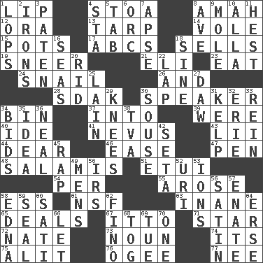 ACROSS 1. Mouth edge 4. Portico 8. Wet nurse 12. Mouth or opening 13. Canvas cover 14. Grand slam 15. Cooking vessels 17. Lettered men learn these first 18. Exchanges for money 19. Contemptuous expression 21. Connecticut Ivy Leaguer 23. Erode 24. Slow-paced one 26. Plus 28. Neighbor of Neb. 30. Orator 34. Storage container 37. To the inside or interior of 39. Past tense of be (plural) 40. Binary compound 41. Congenital growth or mark on the skin 43. Cards in a Roman deck? 44. Letter starter 46. Relaxation 47. Animal enclosure 48. Deli grouping 51. Needle holder 54. For each 55. Came up 58. Double-curved letter 61. Science/research agcy. 63. Empty; void 65. Allots cards 67. "Tell ____ the Marines!" 71. Play the lead 72. Nathan's nickname 73. Part of speech 74. ___ a Wonderful Life 75. Came down and settled, as after flight 76. Double curve, resembling the letter S 77. Born DOWN 1. Chops off 2. Metal shackles 3. Eucharist need 4. R.R. building 5. Keyboard key 6. The grampus (Milton) 7. Domed church section 8. "___ Maria" 9. Undercover agent 10. Silent film actress Nazimova 11. Command 16. Oceans 18. Trig term 20. To free from 22. Pet locale 25. (Had) reclined 27. Fool 29. Leg joints 30. Boozer 31. Seaweed 32. One of the Great Lakes 33. It's straight from the horse's mouth 34. Auction offers 35. The content of cognition 36. Be tempered by heat 38. Federal power corp. 42. Bristle 45. Hit sharply and swiftly 49. Not women's 50. Big collection agency 52. RI univ. 53. Charged particles 56. Smooth fabric 57. Maternal 58. Pulitzer Prize-winning author Ferber 59. Lick closed 60. Suttee (variant) 62. Fine (Spanish) 64. Celtic language 66. Allow 68. Coat; cloak 69. Third day of the wk. 70. Single