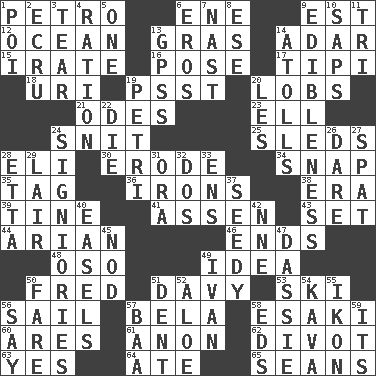 ACROSS 1. Stone: prefix 6. Compass dir. 9. Eastern Standard Time (abbr.) 12. Sea 13. Pate de foie ____ 14. The sixth month of the Jewish calendar 15. Feeling or showing extreme anger 16. Airs 17. Native american tent (variation) 18. RI univ. 19. Inconspicuous attention getter 20. Tennis shots 21. Lyric poems 23. Pipe bend 24. In a ____ (agitated or irritated) 25. Bobsleighs 28. Biblical high priest 30. Wear away 34. Fastener 35. Label 36. Metal shackles 38. Period 39. Prong on a fork 41. NE Netherlands city 43. Arrange properly for use 44. Believer in; advocate of (suffix) 46. Extremities 48. Bear (Spanish) 49. It may be bright or harebrained 50. Flintstone 51. _ Jones' Locker 53. What Jean-Claude Killy likes to do 56. Travel by water 57. Actor Lugosi 58. 1973 Nobel Price Winner (Physics) Leo 60. Ancient Greek god of war 61. At once, immediately (arch.) 62. A piece of turf (Scot.) 63. It is so 64. Had dinner 65. Actors Connery and Penn DOWN 1. Luau course 2. Shade of tan 3. Rend 4. Food allowance for one day 5. Single 6. Greek god of love 7. Political cartoonist Thomas 8. Compass dir. 9. The property of being fit to eat 10. Plant excrements 11. Three (prefix) 13. Global Positioning Systems (abbr.) 14. Ringlike coral islands and reefs 19. _ dish (used to culture cells) 20. French article 22. Pass on 24. Seigniories (variant) 26. Have the gumption 27. Petty quarrel 28. Singer James 29. Den 31. Mouth or opening 32. Two (Sp.) 33. Followers of ems 37. Shabby and untidy 40. Artist's stands 42. Compass dir. 45. Dreamland 47. Hyrax 49. "Terrible" tsar 50. Conductor's collection 51. Gouge 52. _ vera 54. Polynesian shrub of the pepper family 55. Visual representation of an object 56. Declare 57. Sound made by sheep 58. Begley and Asner 59. It is
