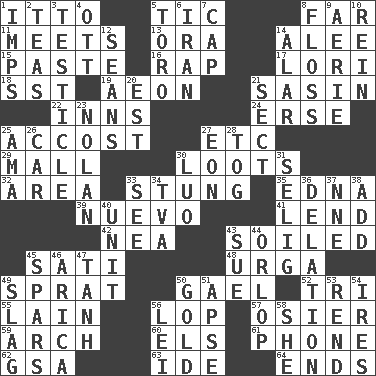 ACROSS 1. "Tell ____ the Marines!" 5. Nervous spasm 8. Distant 11. Confronts 13. Mouth or opening 14. Toward shelter 15. Thick mixture 16. Strike 17. Australian parrot (variant) 18. Fast jet (abbr.) 19. Period of immesurable duration 21. Indian antelope 22. Restaurants 24. Celtic language 25. Buttonhole 27. And so on (abbr.) 29. Promenade 30. Plunders 32. Length times width 33. Feeling sharp psychological pain 35. Pulitzer Prize-winning author Ferber 39. New (sp.) 41. Grant temporary use of 42. Teachers' org. 43. Dirtied 45. Suttee (variant) 48. Capital and largest city of Mongolia 49. Small fatty European fish 50. Highlander 52. Three (prefix) 55. (Had) reclined 56. Trim (branches) 57. Flexible twig of a willow tree 59. Bowlike part 60. Raised railways 61. Give a jingle 62. Girls' org. (abbr.) 63. Binary compound 64. Extremities DOWN 1. Naughty children 2. Afternoon social gatherings 3. One of the two male reproductive glands 4. Baseball player Mel 5. "Corrida" creature 6. SW Asia republic 7. Head covering 8. Soft thread for cleaning between teeth 9. Nest on high 10. It's straight from the horse's mouth 12. Actors Connery and Penn 14. Having or resembling wings 20. Eastern Standard Time (abbr.) 21. Religious group 23. Pitcher Ryan 25. Nanny (var.) 26. Auto 27. A really long time 28. Coat; cloak 30. Nilotic language 31. Former Milwaukee Brewers owner Bud 33. Perceive with the eye 34. Federal power corp. 36. Conveyance 37. Compass dir. 38. Increase 40. A single undivided whole 43. Institute legal proceedings 44. Fourth or lowest deck 45. Practice fights 46. N. Chile seaport 47. Hyperbolic tangent 49. Volcanic refuse 50. Gilt 51. Domed church section 53. Tear apart 54. Angers 56. Flowery wreath 58. A female animal or person