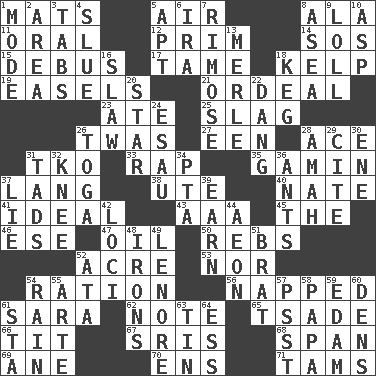 ACROSS 1. Floor coverings 5. Atmosphere 8. Wing 11. Of the mouth 12. Demure 14. Distress signal 15. Alight from a bus 17. Not wild 18. Seaweed 19. Artist's stands 21. Severe or trying experience 23. Had dinner 25. Volcanic refuse 26. It was, poetically 27. Car or cant ending 28. Adept person 31. Ring climax 33. Strike 35. Homeless child 37. Long (Scottish) 38. Shoshoni 40. Nathan's nickname 41. Perfect 43. Auto club (abbr.) 45. Definite Article 46. Compass dir. 47. Petroleum 50. Confederate soldiers (slang) 52. 1/640 square mile 53. And not 54. Food allowance for one day 56. Slept 61. "Two Mules for Sister ____" 62. Short letter 65. Sadhe (variant) 66. Teat (slang) 67. Indian titles of respect 68. Connect, as a bridge 69. A saturated hydrocarbon 70. Followers of ems 71. Scottish caps DOWN 1. Method 2. Length times width 3. Bar bills 4. Change direction abruptly 5. Fitting 6. Retirement account (abbr.) 7. Full of chinks, cracks, or crevices 8. At sea 9. Hang loosely or laxly 10. Viper 13. Haggard of country music 16. Cole _ (cabbage dish) 18. Cask 20. Play the lead 22. Mild oath, euphamism for damn 24. Son of Isaac 26. Ancient Roman robe 28. Housemaid 29. Quote 30. Compass dir. 31. Bits 32. Leg joint 34. Parent Teacher Assoc. 36. Pismires 37. Whopper 39. Merit 42. Venues 44. A really long time 48. Metal shackles 49. Poe poem 51. Naughty child 52. _ moment's notice (2 wds.) 54. Water falling in drops from the sky 55. Johnson of "Laugh-In" 57. Inconspicuous attention getter 58. Dad 59. Dutch treat 60. Hiding places for outlaws 61. R.R. building 63. Metal container 64. Curvy letter