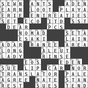 ACROSS 1. Stitched 5. Pismires 9. An important port of Yemen 13. Merit 14. Plunder 15. Beach, in Buenos Aires 16. 4th largest of the Great Lakes 17. Pleas 19. Put into a specified state 20. Environmental prefix 21. It would 22. Fast jet (abbr.) 23. Letter starter 25. Personal Computers (abbr.) 26. Wanderer 30. Stalk of a moss capsule 34. 1973 Nobel Price Winner (Physics) Leo 35. (Had) reclined 36. The sixth month of the Jewish calendar 39. Indian princess (variant) 42. Type of rug 43. Having great length 44. Native American of Southwest Alaska 46. Kenny Rogers chart-topper in '80 47. Remove soap 48. Greek goddess of the dawn 51. Paradise 54. Institute legal proceedings 57. Mouth edge 58. Auto 60. Not either 62. Interpreter 65. Light colored 66. Match 67. Nathan's nickname 68. Comedian Laurel of Laurel & Hardy 69. State of inaction 70. Takes to court 71. Be inclined (to) DOWN 1. Perceives with the eye 2. Having ears or earlike features 3. Compose 4. Compass dir. 5. Actor Baldwin 6. Words to Nanette 7. Small child 8. Empty completely 9. The first octave above the treble staff 10. Raised platform 11. Sight organs 12. Political cartoonist Thomas 15. Groovy apts. 18. And so on (abbr.) 20. Greek god of love 24. Disorder of the immune system 27. Impair 28. Alias (abbr.) 29. Middle Eastern gold or silver currency 30. Scheduled 31. Ewer handle 32. Neckwear 33. Santa ___, CA 36. 100% 37. ___ good deed 38. Added to 40. Connecticut Ivy Leaguer 41. Car or cant ending 45. One who makes use of a thing 48. Otherwise 49. Lubricate 50. Connects, as a bridge 52. Maternal 53. Pitcher Ryan 54. Play the lead 55. Goad 56. Hearing organs 58. ____ d'Azur (French Riviera) 59. Ancient Greek god of war 61. Tear apart 63. Fish or hair follower 64. The 19th letter of the Greek alphabet 65. Pacific Standard Time (abbr.)