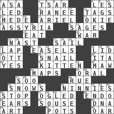 ACROSS 1. White ___ sheet 4. Russian ruler of old 8. French article 11. Directed 12. Indian princess (variant) 14. Labels 15. Ancient Persian 17. Satellite of Uranus 18. Migrant worker of the '30s 19. Nineveh was its capital 21. Gurus 23. Ingest 24. Armed conflict 25. Political cartoonist Thomas 27. Move on water 30. Infant locale 31. Artist's stands 34. Flaplike covering 37. Baseball player Mel 38. Slow-paced one 39. Call ___ day 40. Affirmative reply 41. Baby cat 43. Informal term for the mouth 44. Atlas contents 45. Taken by mouth 47. "Barney Miller" actor Jack 49. Sorrow 50. Frozen precipitation (plural) 52. Fools 56. Halt 57. Stared at amorously 60. Inside; within (prefix) 61. Hearing organs 62. Lush 63. Heredity factor (abbr.) 64. Tate display 65. Plant holders 66. Boat paddle DOWN 1. _ mater 2. Perceives with the eye 3. Does sums 4. Distinguishing feature 5. "Two Mules for Sister ____" 6. Black tropical American cuckoo 7. Portuguese money of account (variant) 8. Member of a famous L.A. basketball team 9. Armor plate that protects the chest 10. Compass dir. 13. Raised railways 14. Ancient Roman robe 16. Sight organs 20. Pace 22. Leather borer 25. Nathan's nickname 26. Tenement units (abbr.) 27. Theater features 28. Set down 29. Capri or Wight 30. Myrna of the movies 32. "____ silly question..." 33. Clip 34. Pale green bean 35. Slanted text style (abbr.) 36. Obsolete 42. Part of speech 44. Cut the grass 46. French philosopher Descartes 47. Derisive sound 48. I made a mistake 49. Amusement-park features 50. Play the lead 51. Mayday 52. Egg locale 53. Southeast Asian peninsula 54. Pulitzer Prize-winning author Ferber 55. Fly high 56. Ocean 58. Republican Party 59. Nilotic language
