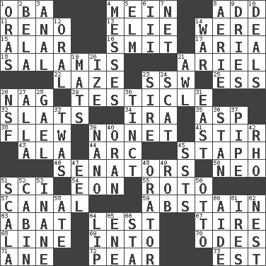 ACROSS 1. Chief or king in Benin or Nigeria 4. Count _ (2 wds.) 8. Say or write further 11. Former U.S. Attorney General Janet 13. Writer Wiesel 14. Past tense of be (plural) 15. Having or resembling wings 16. Stricken, poetically 17. Roberta Peters solo 18. Deli grouping 21. Satellite of Uranus 22. Goldbrick 23. Compass dir. 25. Double-curved letter 26. Tired old horse 29. A testis 32. Narrow boards 34. Retirement account (abbr.) 35. Viper 38. Soared 39. Music written for nine 41. Disorderly outburst 43. Chicken ___ king 44. Curve 45. Staphylococcus 46. Elected representatives 50. Modern: prefix 51. _-fi 54. A really long time 55. Printing process, for short 57. Lessep's creation 59. Choose not to consume 63. Blind as ____ 64. For fear that 67. Hoop that covers a wheel 68. Actor's bit 69. To the inside or interior of 70. Lyric poems 71. One (Scot) 72. Lightbulb-shaped fruit 73. Eastern Standard Time (abbr.) DOWN 1. Mouths or openings 2. Actor Lugosi 3. Of or related to the anus 4. Makes clutter 5. Shade tree 6. One more than two 7. Remaining after all deductions 8. Nest on high 9. Frees from moisture 10. Allots cards 12. Spoken 14. Armed conflict 19. Floor protectors 20. Ending with capital 21. Leather borer 23. The founder of a family 24. Jazz singing style 26. Science/research agcy. 27. Silent film actress Nazimova 28. Highlander 30. A color or tint 31. Compass direction 33. It was, poetically 36. Comedian Laurel of Laurel & Hardy 37. Corncob 39. Billionth: prefix 40. NW Algerian seaport 42. 17th letter of the Greek alphabet 45. Fast planes 47. Snakelike fish 48. Speaker 49. Director Reiner 51. Any of the three canals of the cochlea 52. Apartment or room in a ship 53. Silly 56. Von Bismarck 58. Had dinner 60. Helper 61. Angers 62. Egg locale 64. Mouth edge 65. Compass dir. 66. R.R. building