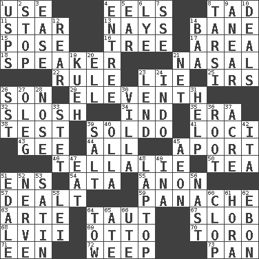 ACROSS 1. Purpose 4. Snakelike fish 8. Bit 11. Play the lead 13. Negative votes 14. Object of repulsion 15. Airs 16. Relationship diagram 17. Length times width 18. Orator 21. Rhinal 22. General guideline 23. Whopper 25. Big collection agency 26. Boy, to dad 29. Veterans Day date 32. Make a splashing sound 34. Indiana (abbr.) 35. Epoch 38. Trial 39. Twentieth part of a lira 41. Event scenes 43. Turn to the right 44. 100% 45. To the left, to Queeg 46. Copy Pinocchio 50. Afternoon social gathering 51. Followers of ems 54. _ moment's notice (2 wds.) 55. Soon (poet.) 57. Started a card game 59. Flamboyance 63. Johnson of "Laugh-In" 64. Drawn tight 67. Messy guy 68. 57 in ancient Rome 69. Von Bismarck 70. "Corrida" creature 71. Car or cant ending 72. Shed a tear 73. Baking dish DOWN 1. United States Postal Service (abbr.) 2. Cease 3. Relaxation 4. Main course 5. Hearing organ 6. Potassium hydroxide 7. Compass dir. 8. Tarsus (plural) 9. Approach 10. Allots cards 12. Stern 14. Sound made by sheep 19. Malaysian steamed pastry 20. Pipe bend 21. Fish or hair follower 23. Grant temporary use of 24. Southeast Asian peninsula 26. Fast jet (abbr.) 27. Cassini of fashion 28. Olfactory organ 30. Country estate 31. Aid 33. Proofreading order 36. Carrot, for example 37. 43,560 square feet 39. Table seasoning 40. Spanish pot 42. Call ___ day 45. A really long time 47. Consume 48. Portable computer 49. _ tizzy (2 wds.) 51. Peak District village in England 52. Effrontery 53. Smooth fabric 56. Political cartoonist Thomas 58. Flowery wreath 60. Hoof sound 61. Israeli folk dance 62. Inky black, to poets 64. Pull behind 65. Had dinner 66. Shoshoni