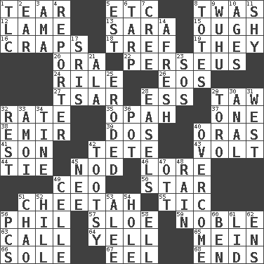 ACROSS 1. Lacerate 5. And so on (abbr.) 8. It was, poetically 12. Unable to walk 13. "Two Mules for Sister ____" 15. Ending for "Through" and "Enough" 16. Dice game 18. Not kosher 19. Those things 20. Mouth or opening 22. Son of Zeus who helped slay Medusa 24. Cause heat under the collar 26. Greek goddess of the dawn 27. Russian ruler of old 28. Double-curved letter 29. The 23rd letter of the Hebrew alphabet 32. Assign a rank or rating to 35. Brightly colored fish 37. Single 38. Independent ruler or chieftain 39. Two (Sp.) 40. Mouths or openings 41. Manchild 42. Wig 43. Electrical Unit 44. Standoff 45. Dreamland 46. Old wives' tales, e.g. 49. Corporate head (abbr.) 50. Play the lead 51. Leopard's kin 55. Nervous spasm 56. Silvers or Donahue 57. _ gin 59. Having high moral qualities 63. Give a ring to 64. Shout 65. Count _ (2 wds.) 66. Not divided or shared with others 67. Snakelike fish 68. Conclusions DOWN 1. Affectionate concern, for short 2. Hearing organ 3. Housemaid (var.) 4. News announcer 5. Eastern Standard Time (abbr.) 6. Canvas cover 7. Algonquian 8. Lugs 9. Chinese city south-southwest of Nanjing 10. Eons 11. Like a shrinking violet 14. Anew 17. Indian titles of respect 21. Insect wing 23. Distress signal 25. Worn away 28. Artist's stands 29. "Corrida" creature 30. Of or related to the anus 31. Compass direction 32. Respite 33. Mine, in Marseilles 34. Prong on a fork 36. Plant holder 40. Conquer 42. Tootsie (variant) 45. Born 47. Baseball player Mel 48. Water falling in drops from the sky 49. Cell (Danish) 51. US Secretary of Labor Elaine L. _ 52. Land elevation 53. Toward shelter 54. Opening into or through something 56. Personal Computers (abbr.) 58. Pipe bend 60. Benjamin's nick name 61. Flaplike covering 62. Followers of ems
