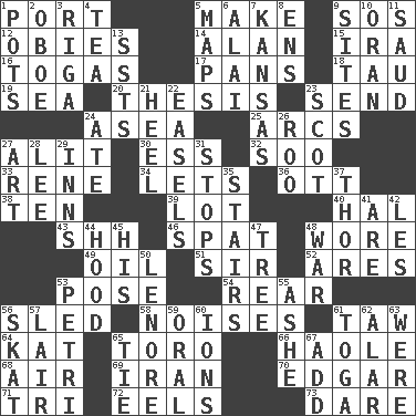 ACROSS 1. Sweet dark-red dessert wine 5. Create 9. Mayday 12. Off-Broadway awards 14. ____ Jay Lerner 15. Lyricist Gershwin 16. Ancient Roman robes 17. Zero-star reviews 18. The 19th letter of the Greek alphabet 19. Ocean 20. College paper 23. Transmit 24. At sea 25. Arches 27. Set down 30. Curvy letter 32. "Barney Miller" actor Jack 33. French philosopher Descartes 34. Allows 36. Baseball player Mel 38. "___ Little Indians" 39. Car dealer's back yard 40. Actor Linden 43. Quiet! 46. Argument over a trivial matter 48. Had on 49. Lubricate 51. Title for a knight 52. Ancient Greek god of war 53. Airs 54. Tail end 56. Downhill vehicle 58. Annoying sounds 61. The 23rd letter of the Hebrew alphabet 64. Krazy ___ of comics 65. "Corrida" creature 66. White Person, in Hawaii 68. Wind 69. SW Asia republic 70. _ Allan Poe 71. Three (prefix) 72. Snakelike fish 73. Have the gumption DOWN 1. Plant holders 2. Mitch Miller's instrument 3. Port city in Latvia 4. Afternoon social gathering 5. Atlas contents 6. Mountain range southwest of Kyrgyzstan 7. Sunflower state 8. Followers of ems 9. Settings 10. Northwest Algerian city 11. Saudi Arabian king (1953-1964) 13. Fast planes 21. The bottom of a shoe or boot 22. Artist's stands 23. Highlander 24. Had dinner 26. Friend of Pooh 27. Tate display 28. Area sheltered from the wind 29. Taverns 31. Closes up, plugs up 35. Flight of steps 37. Son of Odin 41. "We ___ not amused" (Victoria) 42. French article 44. Parka part 45. Part of HMS, perhaps 47. Relationship diagram 48. Armed conflict 50. Poe poem 53. _ dish (used to culture cells) 55. American tennis player Robert 56. Three-handed card game 57. Den 59. Taken by mouth 60. Charged particles 61. Ancient Roman robe 62. Having or resembling wings 63. Past tense of be (plural) 65. Standoff 67. Say or write further