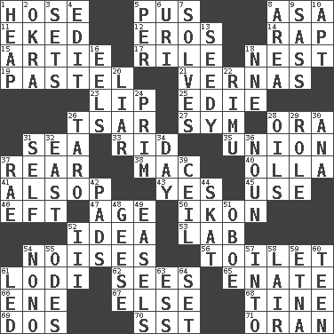 ACROSS 1. Flexible conduit 5. Product of festering 8. White ___ sheet 11. Supplemented with great effort 12. Greek god of love 14. Reproach for some lapse or misdeed 15. Nick name for Arthur 17. Cause heat under the collar 18. Egg locale 19. Soft color 21. Actresses Bloom and Felton 23. Mouth edge 25. Singer Brickell 26. Russian ruler of old 27. Symbol (abbr.) 28. Mouth or opening 31. Ocean 33. To free from 35. The state of being joined or united 37. Located in or toward the back 38. Apple computer (short form) 40. Spanish pot 41. Columnist Joseph or Stewart 43. Affirmative reply 45. Purpose 46. Newt 47. Grow older 50. Picture 52. The main thing one is thinking about 53. Experiment locale 54. Annoying sounds 56. Bathroom 61. Farming town in central California 62. Perceives with the eye 65. Related on the mother's side 66. Compass dir. 67. Otherwise 68. Prong on a fork 69. Two (Sp.) 70. Fast jet (abbr.) 71. NW Algerian seaport DOWN 1. Pile 2. Gumbo ingredient 3. Puts into a specified state 4. Prepare for publication 5. For each 6. RI univ. 7. Finds the solution 8. Length times width 9. Backtalk 10. Fitting 13. Shabby and untidy 16. Snakelike fish 18. Compass dir. 20. One who doesn't tell the truth 22. Tall New Zealand timber tree 24. Demure 26. Edible starchy tuberous root 28. Lubricates 29. Hero or heavy, e.g. 30. Santa ___, CA 31. Automatically 32. Compass direction 34. 24 hours 36. Part of speech 37. Actress Charlotte 39. To provide with a ceiling 42. Groovy apts. 44. Three-handed card game 48. Honkers 49. Artist's stands 51. Mitch Miller's instrument 52. One more than two 54. Words to Nanette 55. Lyric poems 57. To the inside or interior of 58. Den 59. Inactive volcano in Sicily 60. Adolescent 61. Directed 63. Curvy letter 64. Arrange properly for use