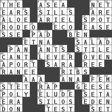 ACROSS 1. Definite Article 4. Toward the sea 8. Remaining after all deductions 11. Hearing organs 13. Beverly of Met fame 15. "We ___ not amused" (Victoria) 16. Medicinal plant 17. Satellite of Uranus 18. Specific locale 19. Cowboy competition 21. Environmental prefix 22. Relaxation 23. Compass dir. 24. Groovy apt. 27. Benjamin's nick name 29. Inactive volcano in Sicily 30. First course 34. Baking dish 36. Pismires 39. Vertical member of a panel or frame 40. Patter 41. Prying instrument 43. Baking chamber 44. To the left, to Queeg 46. "Two Mules for Sister ____" 47. To sift 48. The wife of a rajah (variant) 49. Teases 51. Auto club (abbr.) 53. Santa ___, CA 54. Opposite of masc. 57. Proofreading order 60. Hit sharply and swiftly 63. Honkers 65. Much (prefix) 66. Evade 69. Stalk of a moss capsule 70. Epoch 71. Grain storage towers 72. Paradise 73. Spanish title 74. Trial 75. Put into a specified state DOWN 1. Separates forcefully 2. Auras 3. Wear away 4. White ___ sheet 5. Title for a knight 6. Writer Wiesel 7. Actor Baldwin 8. California wine valley 9. Greek god of love 10. False hair 12. Observe 14. Oscar Madison type 18. Legislators 20. Choose 25. Of or related to the anus 26. Natives or inhabitants of Denmark 28. Double-curved letter 29. Plea 31. Not recorded 32. Toward shelter 33. Lair 34. Dad 35. Soon (poet.) 37. Federal power corp. 38. Spanish missionary in California 40. Auto 42. Precipitation 45. Beverage made from leaves 50. Container for groceries 52. Ancient Greek god of war 54. Eats 55. First name in cosmetics 56. Intended 57. Broke a traffic law 58. "Corrida" creature 59. Style 61. Came down and settled, as after flight 62. Whimper 64. Compass dir. 67. Two (Sp.) 68. Eastern Standard Time (abbr.)