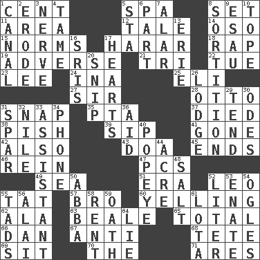 ACROSS 1. Penny 5. Health resort 8. Arrange properly for use 11. Length times width 12. Story 14. Bear (Spanish) 15. Typical standards 17. Ethiopian city, capital of Harari 18. Strike 19. Contrary to your interests or welfare 21. Three (prefix) 22. Third day of the wk. 23. Area sheltered from the wind 24. _ tizzy (2 wds.) 25. Biblical high priest 27. Title for a knight 28. "Beetle Bailey" pooch 31. Fastener 35. Parent Teacher Association (abbr.) 37. Passed on 38. Expression of disdain 39. Small drink 41. Went 42. In addition 43. ___ good deed 45. Extremities 46. It's straight from the horse's mouth 47. Personal Computers (abbr.) 49. Ocean 51. Period 52. Lion 55. Make lace 57. Sis' sibling 60. Crying or shouting loudly 62. Wing 63. Calif. Air Force Base 65. "_____ Recall" 66. One of the 12 tribes of Israel 67. Against 68. Wig 69. Be seated 70. Definite Article 71. Ancient Greek god of war DOWN 1. Lessep's creation 2. Wear away 3. Effrontery 4. Docile 5. R.R. building 6. Component 7. Having or resembling wings 8. Determination 9. He sold his birthright 10. Drink excessively 13. One of the Great Lakes 16. Indian titles of respect 17. Centers 20. Clip 26. Cabin 29. Look after 30. Lyric poems 31. Practice fight 32. The longest river in the world 33. Aide 34. Give a jingle 36. Assist 40. Wimpy's pal 44. Land measure 48. Table seasoning 50. Swedish rock group 52. 61 cubic inches 53. Related on the mother's side 54. Stares 55. Small amounts or degrees 56. Jai _ 58. Monthly bill 59. Pledge 61. Globular water bottle used in Asia 64. Falsehood