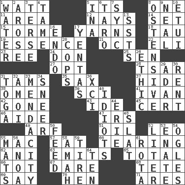 ACROSS 1. Electrical Unit 5. ___ a Wonderful Life 8. Single 11. Length times width 12. Negative votes 14. Put into a specified state 15. Singer Mel 17. Tall tales 18. The 19th letter of the Greek alphabet 19. Core 21. Sep. follower 22. Biblical high priest 23. To riddle 24. Spanish title 25. Elected rep. 27. Choose 28. Russian ruler of old 31. Scottish caps 35. Saxophone 37. Flintstone garb 38. Sign of something about to happen 39. _-fi 41. "Terrible" tsar 42. Went 43. Binary compound 45. Foregone conclusion 46. Helper 47. Big collection agency 49. Sandy's bark 51. Petroleum 52. Lion 55. Big _ 57. Ingest 60. Pulling apart 62. Black tropical American cuckoo 63. Gives off 65. "_____ Recall" 66. Small child 67. Have the gumption 68. False hair 69. Declare 70. Layer 71. Ancient Greek god of war DOWN 1. Wetness 2. Came up 3. Laconic 4. Docile 5. _ tizzy (2 wds.) 6. Edible starchy tuberous root 7. Synchronize (abbr.) 8. Clearly or manifestly demonstrative 9. Be tempered by heat 10. Needle holder 13. Fast planes 16. Inside; within (prefix) 17. Gossips 20. 911 reaches them 26. Value system 29. The sixth month of the Jewish calendar 30. Monthly bill 31. Ancient Roman robe 32. Mine, in Marseilles 33. Ananias' fault 34. Scornful expression 36. One more than ninety 40. Foolish or stupid persons 44. 4th largest of the Great Lakes 48. Narrow board 50. Nourish 52. 61 cubic inches 53. Related on the mother's side 54. Stares 55. Floor coverings 56. Small Philippine buffalo 58. Nanny 59. Hoop that covers a wheel 61. Round or rotation of duties 64. "___ Little Indians"