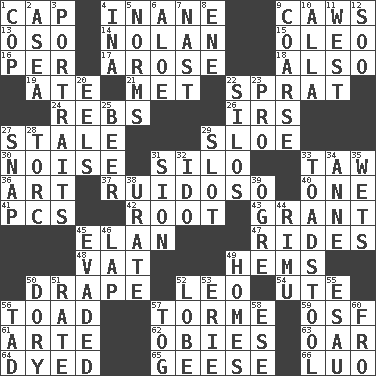 ACROSS 1. Head covering 4. Silly 9. Crow sounds 13. Bear (Spanish) 14. Pitcher Ryan 15. Butter sub 16. For each 17. Came up 18. In addition 19. Had dinner 21. Was introduced to 22. Small fatty European fish 24. Confederate soldiers (slang) 26. Big collection agency 27. Lacking originality or spontaneity 29. A type of plum 30. Annoying sound 31. Grain storage tower 33. The 23rd letter of the Hebrew alphabet 36. Tate display 37. Noisy, rowdy, vocal (Spanish) 40. Single 41. Personal Computers (abbr.) 42. Carrot, for example 43. Monetary aid 45. Enthusiasm 47. Amusement-park features 48. Large container 49. Equivocates 50. Window treatment 52. Lion 54. Shoshoni 56. Frog relative 57. Singer Mel 59. Order of Saint Francis (abbr.) 61. Johnson of "Laugh-In" 62. Off-Broadway awards 63. Rowing implement 64. Colored 65. Honkers 66. Nilotic language DOWN 1. Police officer (slang) 2. At sea 3. Likenesses of persons 4. _ tizzy (2 wds.) 5. Typical models 6. Medicinal plant 7. Political cartoonist Thomas 8. Compass dir. 9. Unrefined 10. Silent film actress Nazimova 11. 270 degrees 12. "Barney Miller" actor Jack 20. Snakelike fish 22. Grain storage towers 23. Adept person 25. Fermented drink made from hops 27. Fastener 28. Torque (variant) 29. Notch 31. The Jewish people; Israel 32. Wedding promise 33. Inedible or poisonous agaric 34. Queen of England 1702-14 35. Moistens 38. A salt of uric acid 39. Legendary monster 44. Tall New Zealand timber tree 45. Eluded 46. Infant locale 49. Residences 50. Dinghy 51. Assign a rank or rating to 52. Ear part 53. 4th largest of the Great Lakes 55. He sold his birthright 56. Small boy 57. Coat; cloak 58. Compass dir. 60. Away