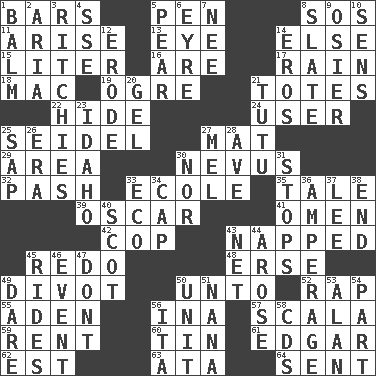 ACROSS 1. Drinking establishments 5. Writing instrument 8. Mayday 11. Originate 13. Sight organ 14. Otherwise 15. 61 cubic inches 16. "We ___ not amused" (Victoria) 17. Water falling in drops from the sky 18. Apple computer (short form) 19. Legendary monster 21. Hauls 22. Flintstone garb 24. One who uses or employs something 25. Beer mug 27. Floor protector 29. Length times width 30. Mole, birthmark 32. Romantic infatuation 33. Learning spot: Fr. 35. Falsehood 39. Witty Wilde 41. Presage 42. Police officer (slang) 43. Slept 45. Make new 48. Celtic language 49. A piece of turf (Scot.) 50. To (old English) 52. Hit sharply and swiftly 55. Arabian gulf 56. _ tizzy (2 wds.) 57. Any of the three canals of the cochlea 59. Monthly bill 60. Shallow baking pan 61. _ Allan Poe 62. Eastern Standard Time (abbr.) 63. _ moment's notice (2 wds.) 64. Posted DOWN 1. Lip ointment 2. Roberta Peters solo 3. Actors Guy, Robert Welles, and Clint 4. Compass dir. 5. Lightbulb-shaped fruit 6. Jane of fiction 7. Born 8. Chalkboard 9. Flexible twig of a willow tree 10. Elected reps. 12. Eat (away) 14. Greek god of love 20. Set 21. Ballerina skirt 23. Potato state 25. Plant excrement 26. Period 27. Cartoonist voice _ Blanc 28. "___ Maria" 30. And not 31. Discontinues 33. Environmental prefix 34. Head covering 36. Electrical Measurement 37. Area sheltered from the wind 38. Conclude 40. Native of Scotland 43. Remaining after all deductions 44. Came up 45. Amusement-park features 46. Happening 47. Do not 49. Have the gumption 50. A single undivided whole 51. Nanny 53. ____ Jay Lerner 54. Component 56. Call ___ day 58. Music discs