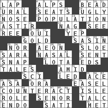 ACROSS 1. Infant locale 4. High mountains 8. Necklace unit 12. Mountain range 14. Theater features 16. Unsightly 17. Olfactory organ 18. Census information 20. Having gotten out of bed 22. Tired old horse 23. Observe 24. To riddle 25. Fr. "Yes" 28. Slangy assent 30. Gilded 31. Indian antelope 35. Not either 37. A really long time 40. A type of plum 41. "Two Mules for Sister ____" 42. Relating to the nose 44. Posted 45. Fastener 46. Globular water bottle used in Asia 47. Begley and Asner 48. Lies 50. Among 52. _-fi 54. Directed 55. Adept person 58. White ___ sheet 61. Mouth or opening 63. Artist's stand 65. Neutralize 70. Small island 71. Hero or heavy, e.g. 72. Sir (Sp.) 73. Baby powder 74. Inside; within (prefix) 75. Suttee (variant) 76. Was introduced to DOWN 1. Type of eclipse 2. Came up 3. Thick mixture 4. Viper 5. Lion 6. Infant food 7. Surprise greatly 8. On the contrary 9. The front part of a cuirass 10. _ vera 11. Centimeter-gram-second unit of force 13. Luau accessory 15. Kill 19. Matures 21. Friend of Pooh 26. ____ Bator, Mongolia 27. Standard of perfection 29. Went by 30. Wine fruits 32. Downhill vehicle 33. Charged particles 34. Remaining after all deductions 35. Nanny 36. Of the mouth 38. Bear (Spanish) 39. Relating to or accompanying birth 41. Fast jet (abbr.) 43. Unable to walk 49. Native of Scotland 51. Binary compound 53. Angers 55. Indian state 56. Cell (Danish) 57. Opt 58. Measure of real estate 59. Within a short period 60. Old (Scot.) 62. Ancient Greek god of war 64. Small island 66. Modern: prefix 67. Santa ___, CA 68. Small bed 69. Three (prefix)