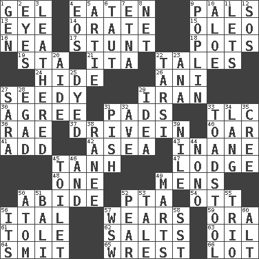 ACROSS 1. Set 4. Ingested 9. Friends 13. Sight organ 14. Declaim 15. Butter sub 16. Teachers' org. 17. Check the growth or development of 18. Plant holders 19. R.R. building 21. Call ___ day 22. Stories 24. Flintstone garb 26. Cuckoo 27. Morally degraded 29. SW Asia republic 30. Match 31. Groovy apts. 33. Affectionate concern, for short 36. Actress Charlotte 37. Popular '50s hangout 40. Rowing implement 41. Say or write further 42. At sea 43. Empty; void 45. Hyperbolic tangent 47. Cabin 48. Single 49. Not women's 50. Tolerate 52. Parent Teacher Assoc. 54. Baseball player Mel 56. Slanted text style (abbr.) 57. Erodes 59. Mouth or opening 61. Lacquered or enameled metalware 62. Table seasonings 63. Lubricate 64. Stricken, poetically 65. Take or capture by force 66. Car dealer's back yard DOWN 1. Commissioned military rank (abbr.) 2. Sight organs 3. Resembling or made to resemble leather 4. Greek goddess of the dawn 5. Nick name for Arthur 6. Strained 7. Inactive volcano in Sicily 8. Fish or hair follower 9. Cotton for raincoats, e.g. 10. _ vera 11. Allows 12. Distress signal 20. Helper 22. Tarsus (plural) 23. Santa ___, CA 25. Colored 27. "Two Mules for Sister ____" 28. Mild oath 29. It may be bright or harebrained 31. Expression of disdain 32. "___ Maria" 33. Inedible or poisonous agaric 34. Austrian-born American filmmaker Fritz 35. Algonquian 38. Indian princess (variant) 39. Mediterranean tributary 44. Words to Nanette 45. Bathroom 46. Also 49. Shops 50. Smallest unit of an element 51. Indonesian resort city 52. Lightbulb-shaped fruit 53. Falsehood 55. Musical group of three 56. ___ a Wonderful Life 57. Compass dir. 58. Fast jet (abbr.) 60. The first octave above the treble staff