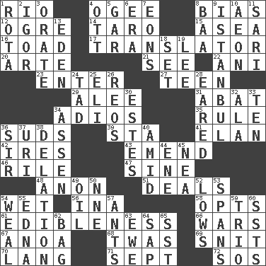 ACROSS 1. _ de Janeiro 4. Double curve, resembling the letter S 8. Prejudice 12. Legendary monster 14. Edible starchy tuberous root 15. Toward the sea 16. Frog relative 17. Interpreter 20. Johnson of "Laugh-In" 21. Perceive with the eye 22. Black tropical American cuckoo 23. Keyboard key 27. Adolescent 29. Toward shelter 31. Blind as ____ 34. Goodbye (Sp.) 35. Governing power 36. Beer foam 39. R.R. building 41. Flair 42. Angers 43. Make improvements or corrections to 46. Cause heat under the collar 47. Trig term 48. At once, immediately (arch.) 51. Allots cards 54. Soggy 56. _ tizzy (2 wds.) 58. Chooses 61. The property of being fit to eat 66. Armed conflicts 67. Small Philippine buffalo 68. It was, poetically 69. In a ____ (agitated or irritated) 70. Long (Scottish) 71. Back-to-school mo. 72. Distress signal DOWN 1. Round or rotation of duties 2. Composer Stravinsky 3. Declaim 4. Baseball player Mel 5. Slender fish 6. Period 7. Immeasurably long periods of time 8. Sound made by sheep 9. Byzantium, centuries later 10. Period of immesurable duration 11. Indian skirt 13. Locale of original sin 18. Put into a specified state 19. Area sheltered from the wind 24. Bit 25. Connecticut Ivy Leaguer 26. Vintage cars 28. Having ears or earlike features 30. _____ Park, CO 32. According to 33. Nine, plus one 34. NE Netherlands city 36. Title for a knight 37. RI univ. 38. Conveyance 40. Among 44. Compass dir. 45. Teachers' org. 49. Lubricate 50. Compass dir. 52. Moos 53. Connects, as a bridge 54. Welt 55. Pulitzer Prize-winning author Ferber 57. Pismires 59. Musical group of three 60. Fast planes 62. Container for groceries 63. She-sheep 64. Plant excrement 65. Fast jet (abbr.)